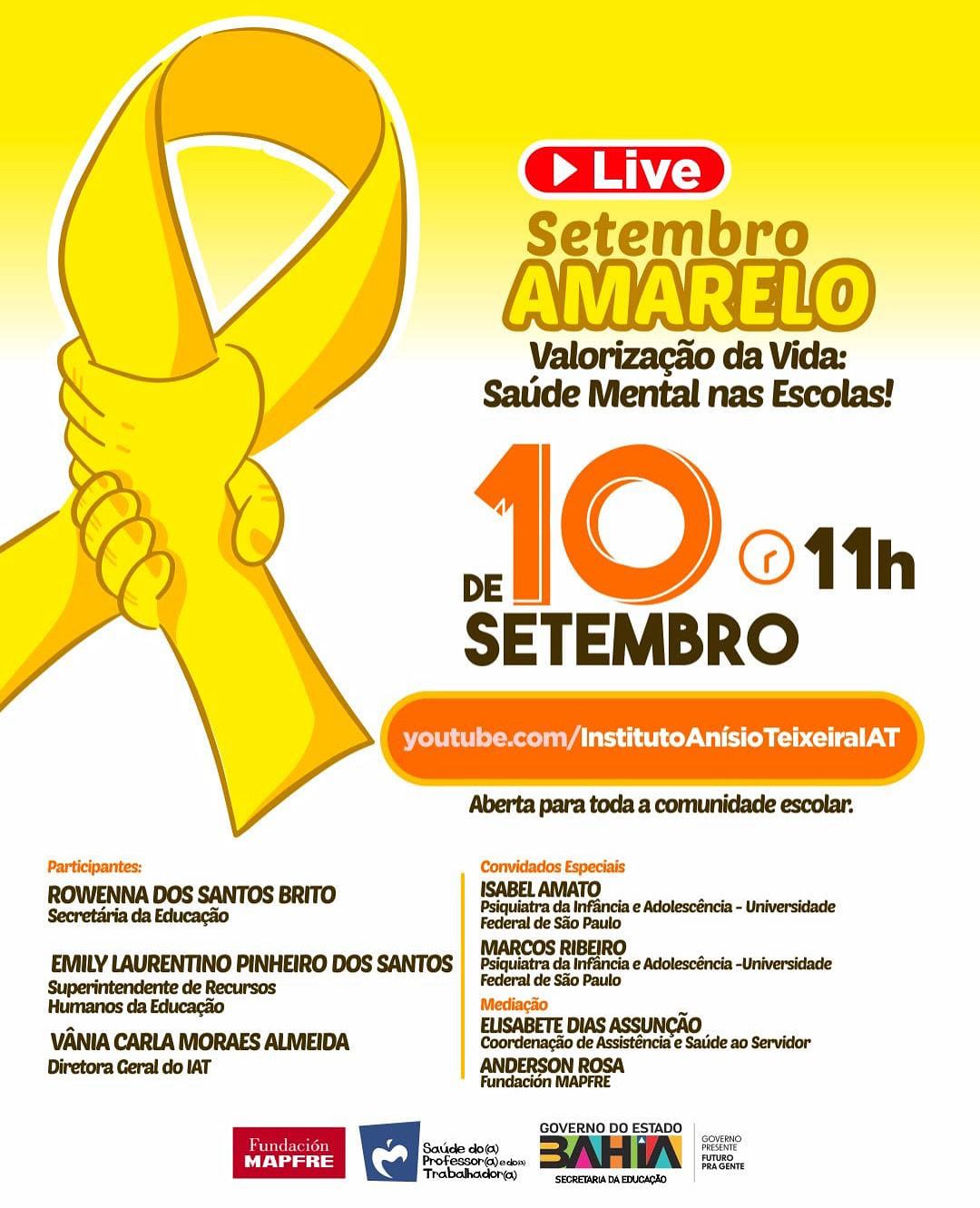A Secretaria da Educação do Estado da Bahia (SEC) promove, nesta quarta-feira (10), às 11h, uma live especial sobre a valorização da vida e a saúde mental nas escolas. A iniciativa integra a campanha Setembro Amarelo, que tem como tema, este ano, “Conversar pode mudar vidas” e marca o Dia Mundial de Prevenção ao Suicídio, celebrado em 10 de setembro. A ação acontece em parceria com o Instituto Anísio Teixeira (IAT), a Universidade Federal de São Paulo (UNIFESP) e a Fundación MAPFRE, com transmissão pelo canal do IAT, no YouTube.