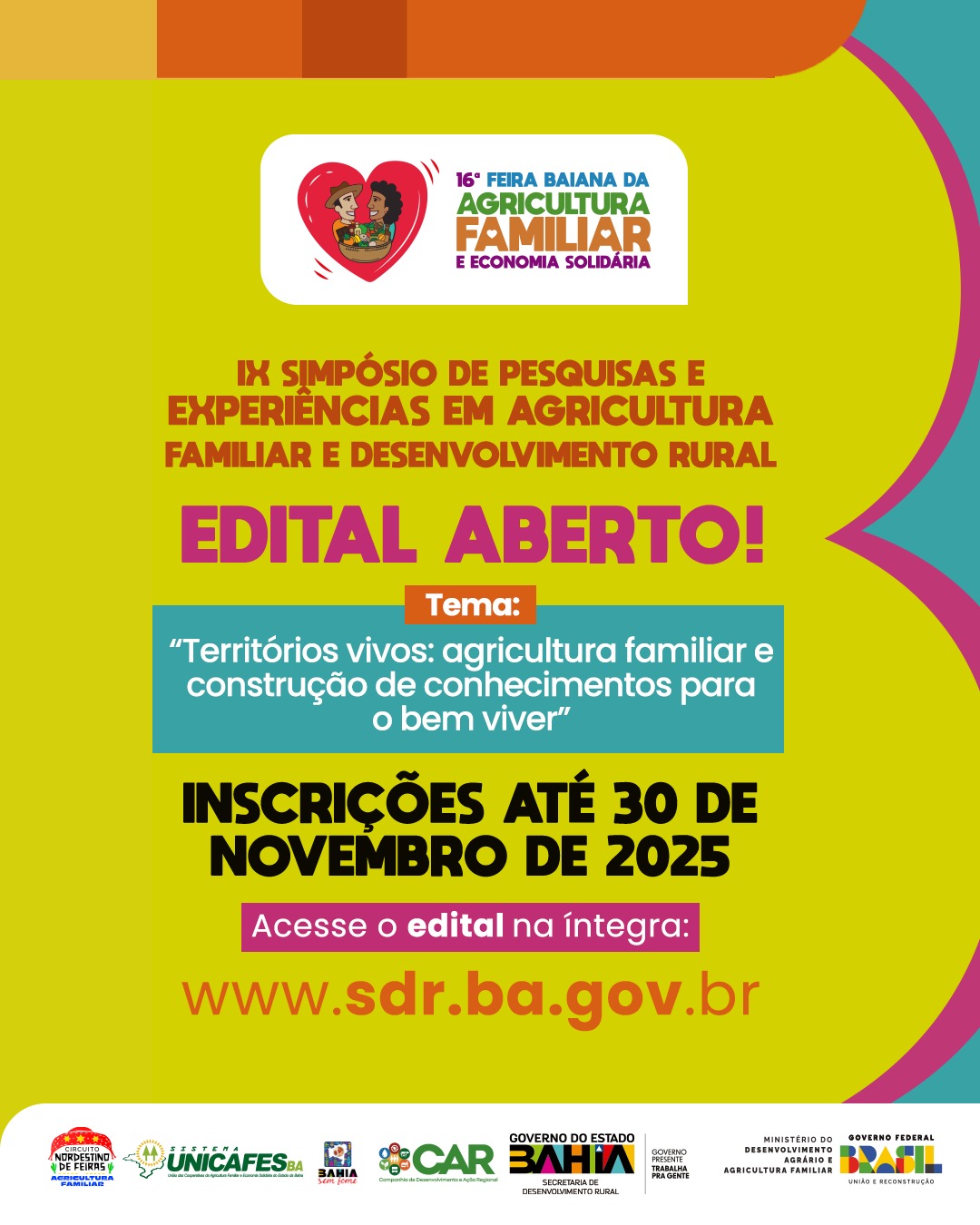 O 9º Simpósio acontece no dia 11 de dezembro de 2025, durante a 16ª Feira Baiana de Agricultura Familiar e Economia Solidária, no Parque Costa Azul, em Salvador-Bahia. O Edital está disponível em www.sdr.ba.gov.br/editais e as inscrições seguem abertas até o dia 30 de novembro de 2025. Elas são gratuitas e devem ser realizadas mediante preenchimento de formulário disponível na internet, no link: https://forms.gle/7SJity9cwBub1udy5, contendo resumo simples da proposta.