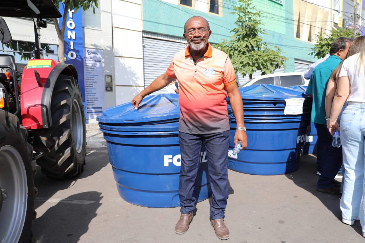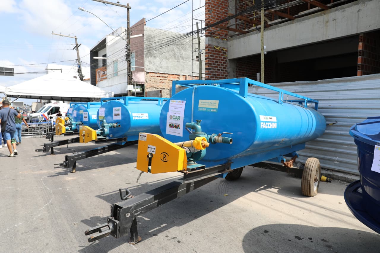 No município de Riachão do Jacuípe, foram entregues quatro máquinas forrageiras, 375 caixas d’água de 5 mil litros, um tanque-pipa de 4 mil litros e 30 barracas padronizadas de feira livre. Os equipamentos vão contribuir para o armazenamento de água nas comunidades rurais, além de agilizar o preparo de rações e fortalecer a comercialização da produção agrícola local.