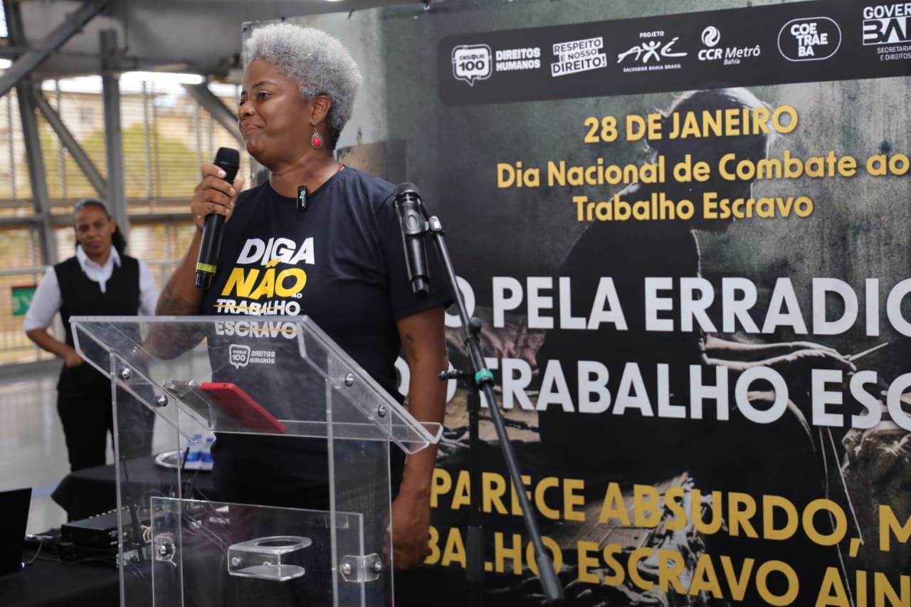 Com emoção, escuta ativa e compromisso coletivo, a Secretaria de Justiça e Direitos Humanos da Bahia (SJDH) e o Metrô Bahia realizaram, na última quarta-feira (28), o Ato pela Erradicação do Trabalho Escravo, na Estação de Metrô da Rodoviária (Iguatemi), em Salvador. A mobilização integrou a programação do Dia Nacional de Combate ao Trabalho Escravo, reunindo órgãos públicos, entidades da sociedade civil e usuários do transporte público em um dos pontos de maior circulação da capital.