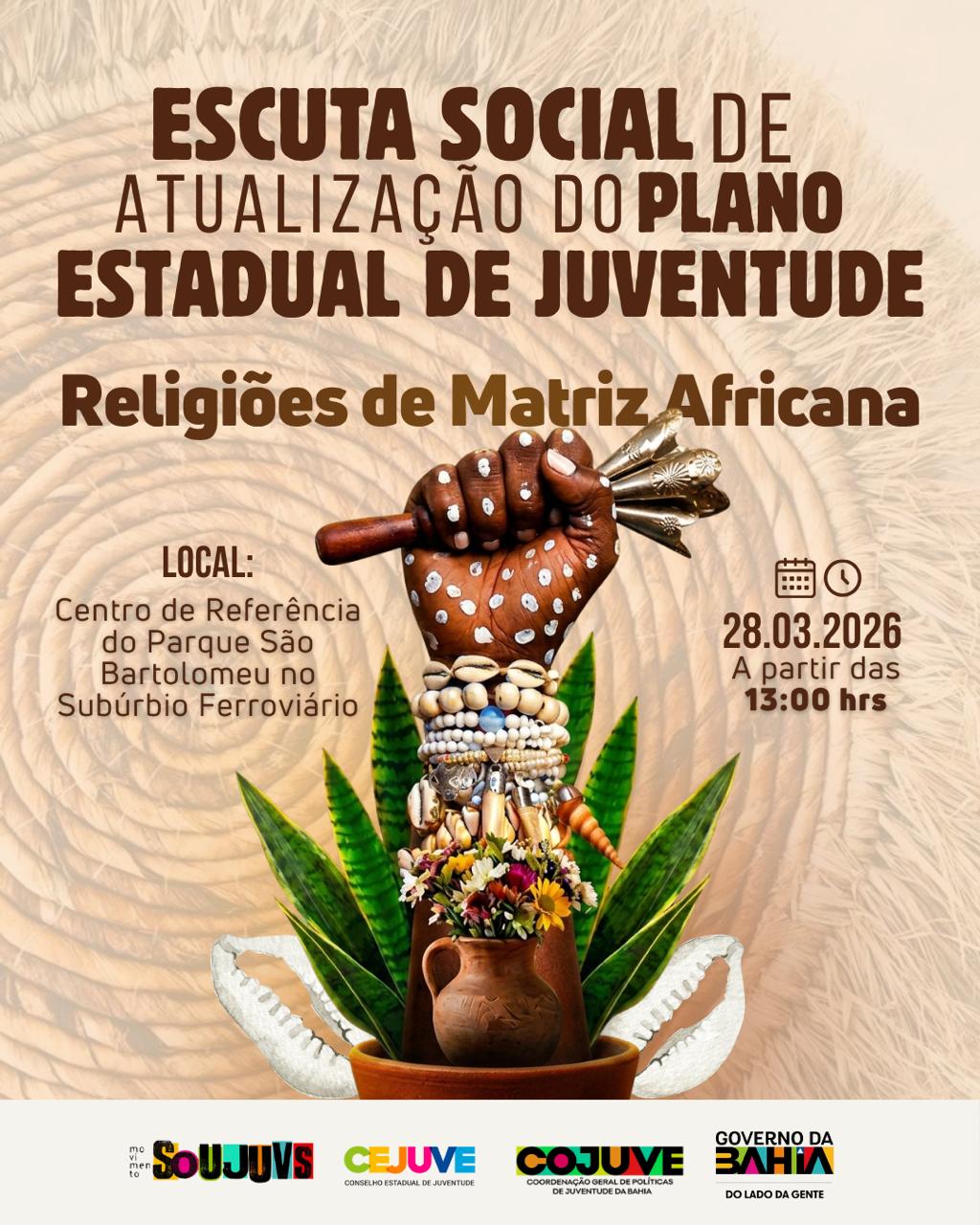 No turno da tarde, a partir das 13h, será a vez da Escuta direcionada às juventudes de religiões de matriz africana. A atividade acontecerá no Centro de Referência do Parque São Bartolomeu, localizado no Subúrbio Ferroviário, em Plataforma. O espaço, marcado por sua relevância histórica, cultural e ambiental, será palco de discussões que valorizam a diversidade religiosa e reconhecem a importância das tradições de matriz africana na formação social da Bahia.