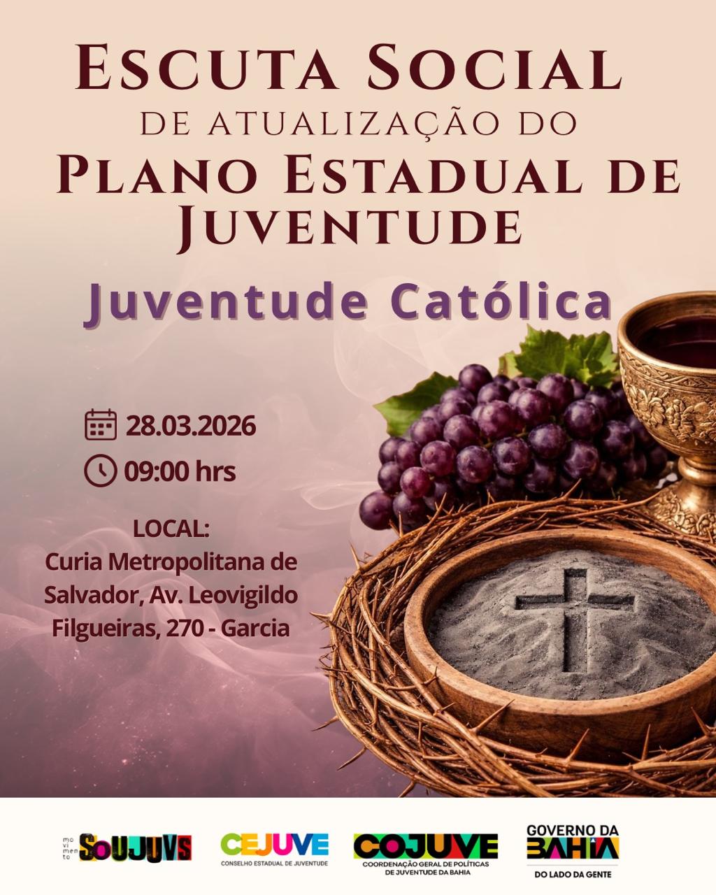 A programação terá início às 9h, com a Escuta Social voltada às juventudes católicas, que será realizada na Cúria Metropolitana de Salvador, no bairro do Garcia. O encontro pretende reunir jovens ligados a pastorais, movimentos e comunidades religiosas, promovendo um espaço de diálogo sobre temas como educação, trabalho, cultura, saúde mental e participação social.