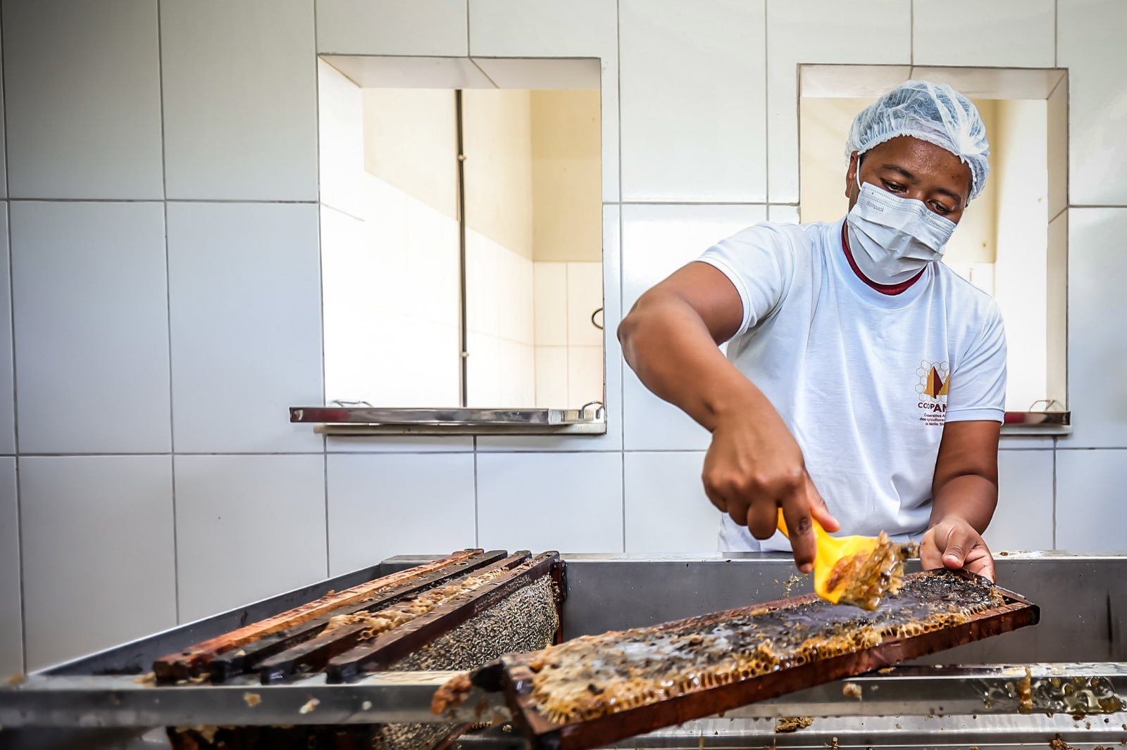 No povoado de Papagaio, a unidade de beneficiamento de mel já envolve cerca de 60 famílias. A estrutura inclui novos equipamentos que melhoram as condições de trabalho e a produtividade.