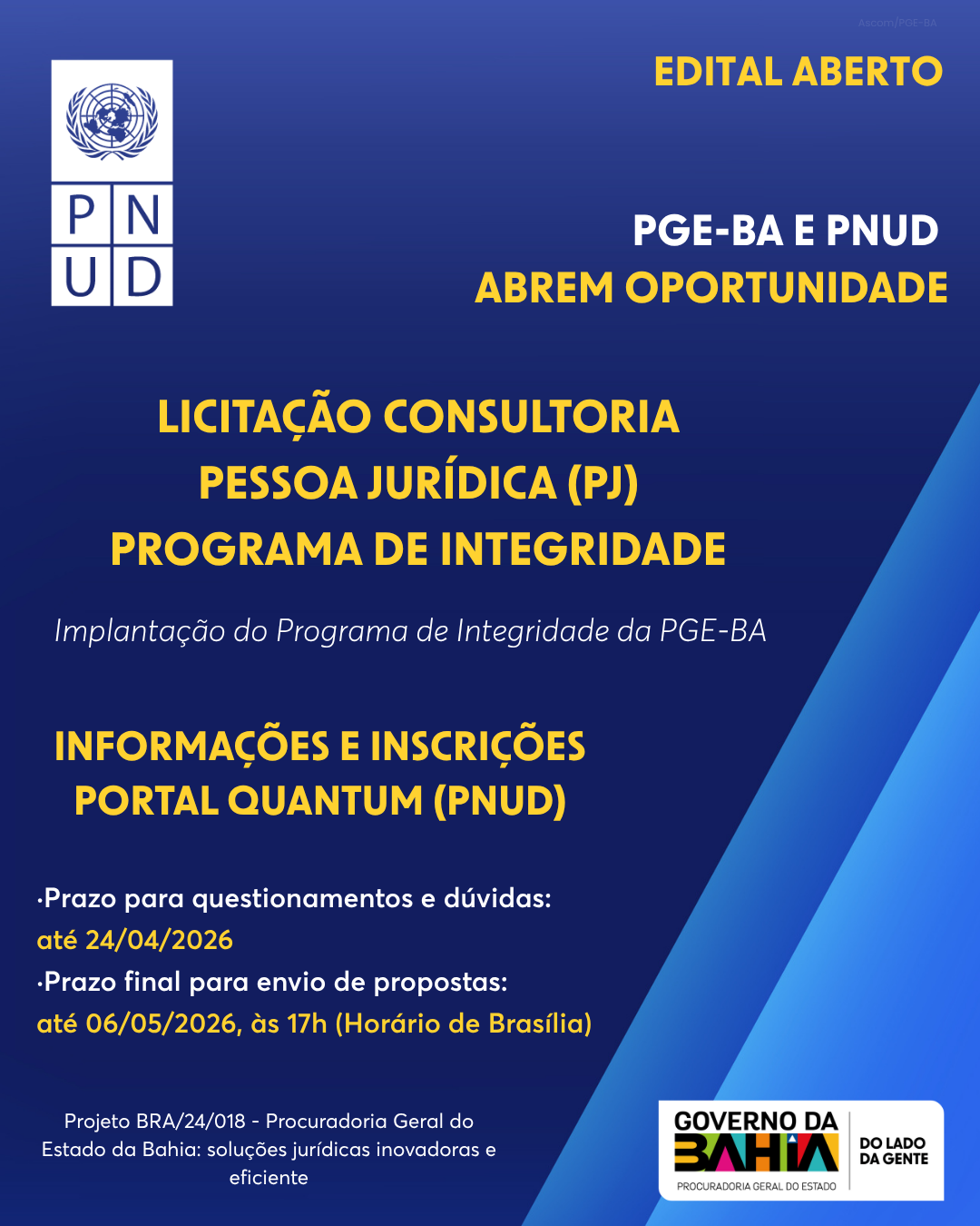 A Procuradoria Geral do Estado da Bahia (PGE-BA), em parceria com o Programa das Nações Unidas para o Desenvolvimento (PNUD), está com seleção aberta para contratação de empresa especializada (Pessoa Jurídica) que atuará na implantação do Programa de Integridade da instituição, no âmbito do Projeto BRA/24/018.