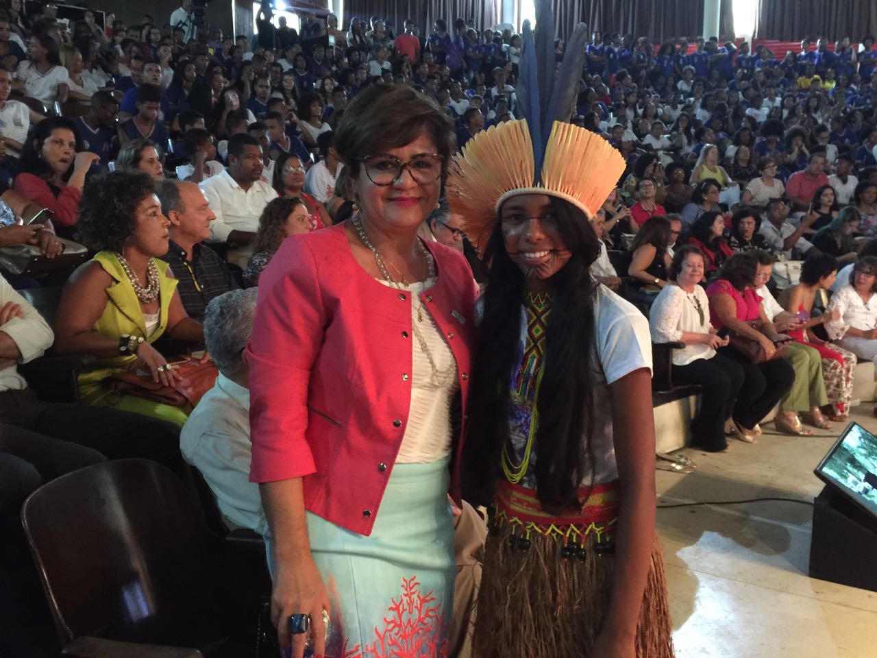 À esquerda, Anatércia Contreiras (Presidente CEE/BA), Walter Pinheiro (Secretário da Educação) e Angelo Almeida (Deputado Estadual). Na foto à direita, o Auditório lotado do Centro Educacional Carneiro Ribeiro (Escola Parque)