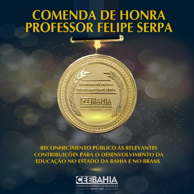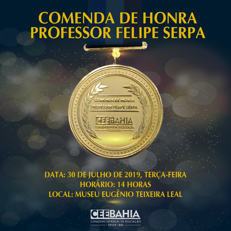 O Conselho Estadual de Educação da Bahia (CEE/BA) concede, pelo segundo ano consecutivo, a Comenda de Honra Professor Felipe Serpa. Em sessão solene, a realizar-se às 14 horas desta terça-feira, 30 de julho, no Museu Eugênio Teixeira Leal – Pelourinho, Renée Albagli Nogueira e os representantes de Edivaldo Machado Boaventura e Iracy Silva Picanço (ambos post mortem) recebem a honraria em reconhecimento público às relevantes contribuições para o desenvolvimento da Educação no Estado da Bahia e no Brasil. Os homenageados foram eleitos pelos votos da maioria dos conselheiros, de acordo com os critérios da Resolução CEE/BA nº 144, de 22 de agosto de 2017.