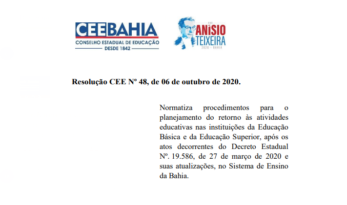 Sobre o retorno às atividades educativas nas instituições da educação básica e da educação superior, a Resolução CEE Nº 48/2020, ainda a ser homologada e publicada, normatiza procedimentos a serem adotados sistema estadual de ensino da Bahia após a suspensão dos atos decorrentes do Decreto Estadual N.º 19.529, de 16 de março de 2020 e suas atualizações.