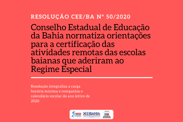 Validar as atividades curriculares do Regime Especial, integralizar a carga horária mínima e reorganizar o calendário escolar do ano letivo de 2020 são os objetivos da Resolução nº 50 do Conselho Estadual de Educação da Bahia (CEE/BA). Publicada no Diário Oficial do Estado (DOE) desta quinta-feira, 19 de novembro de 2020, a Resolução reafirma a necessidade de fiscalização das instituições que aderiram ao regime especial para manter o funcionamento dos seus atos de currículo, ou seja, as ações de ensino remoto realizadas neste longo período de interrupção do fluxo presencial, devido à pandemia da COVID-19.