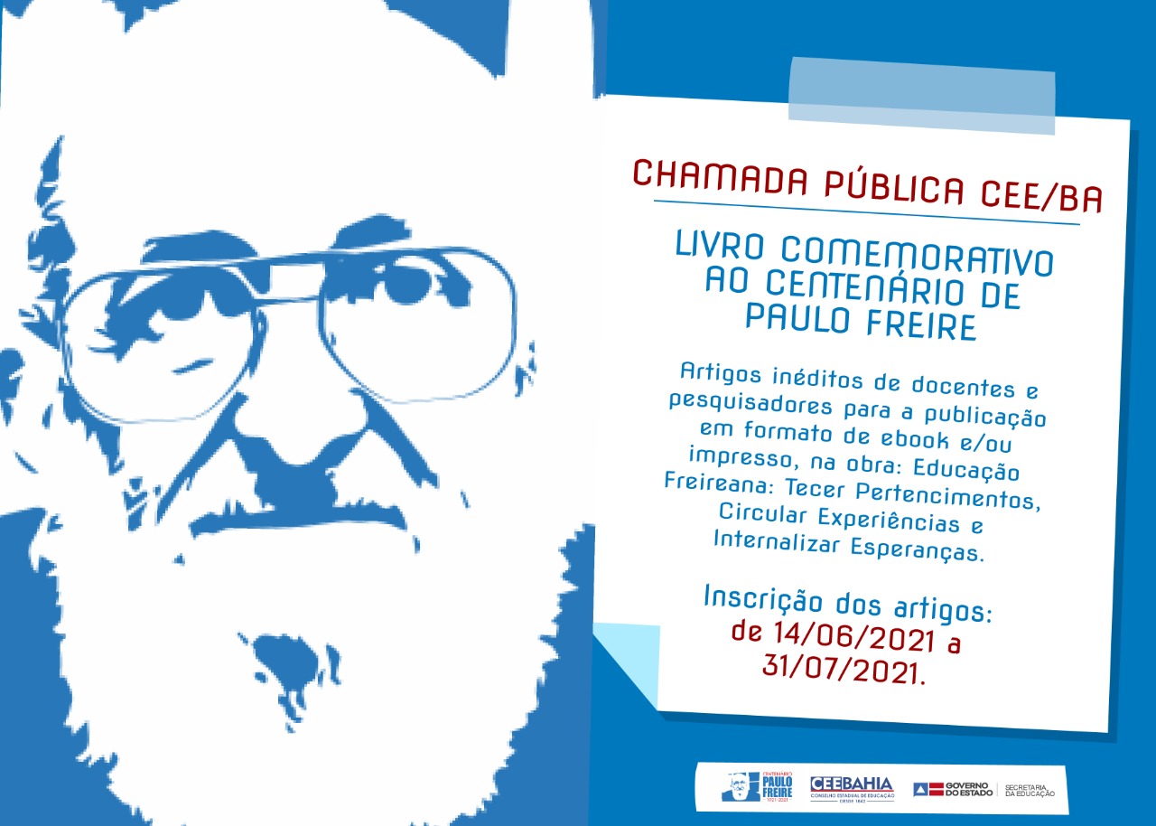 O Conselho Estadual de Educação da Bahia (CEE-BA) divulgou, nesta sexta-feira, 11 de junho, a chamada pública para publicação de artigos em livro comemorativo ao centenário de Paulo Freire. A proposta tem como objetivo receber artigos inéditos de pesquisadores e docentes para publicação intitulada: Educação Freireana: tecer pertencimentos, circular experiências e internalizar esperanças.