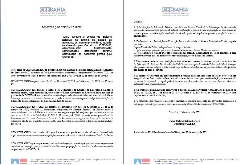 CONSIDERANDO que, durante a vigência da Declaração de Situação de Emergência em todo o território baiano, supra mencionada, decretada pelo Exmo. Governador do Estado da Bahia em face da pandemia da COVID-19 e enquanto não autorizada pela referida autoridade a retomada das atividades letivas presenciais no território baiano, é vedada a oferta de ensino presencial pelas instituições de Educação Básica integrantes do Sistema Estadual de Ensino;