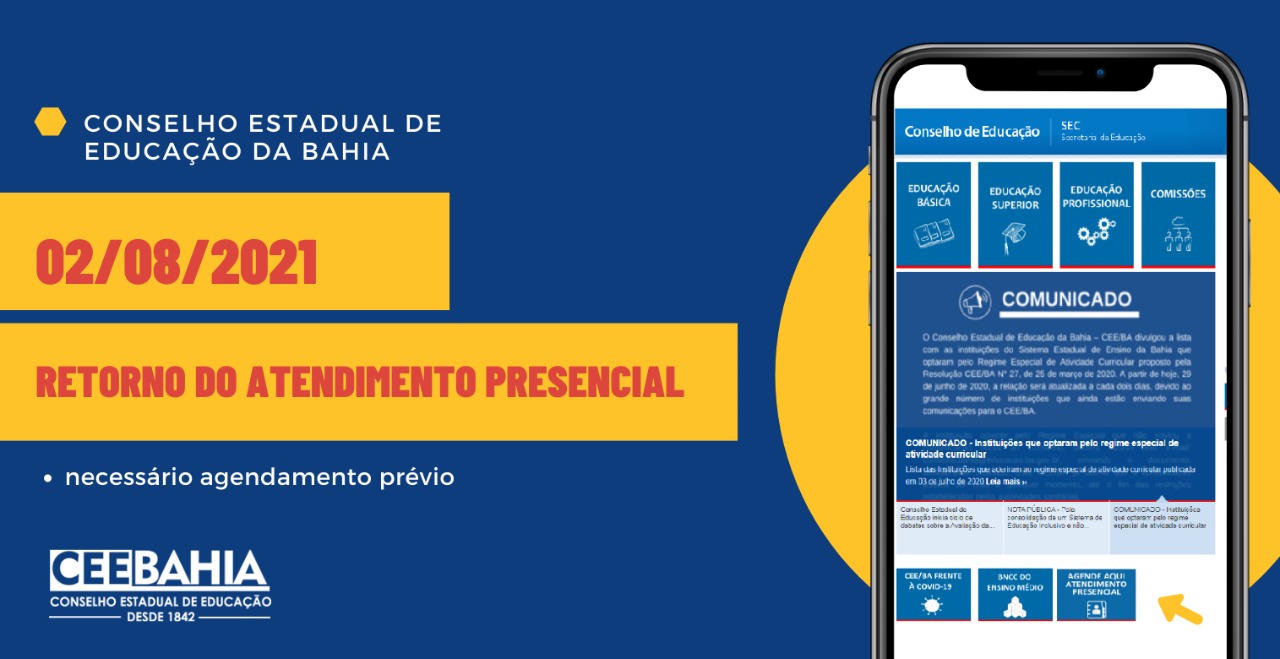 O Conselho Estadual de Educação da Bahia (CEE/BA) retoma, nesta segunda-feira, 02 de agosto de 2021, o atendimento ao público na sua sede, em Salvador. O atendimento presencial será viabilizado com agendamento prévio (data e horário pré-estabelecidos), cumprindo todas as medidas de segurança previstas para salvaguardar a saúde dos funcionários e da população.