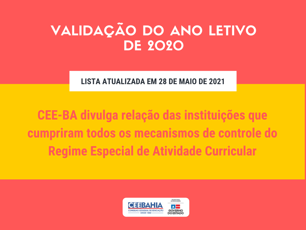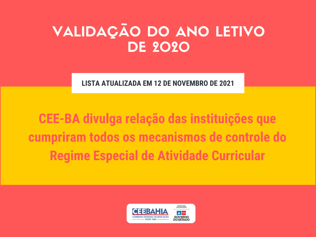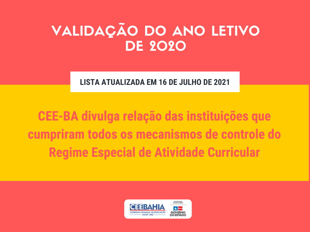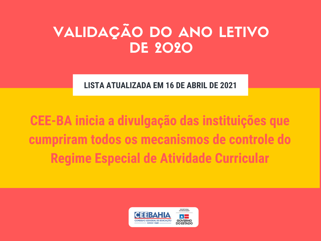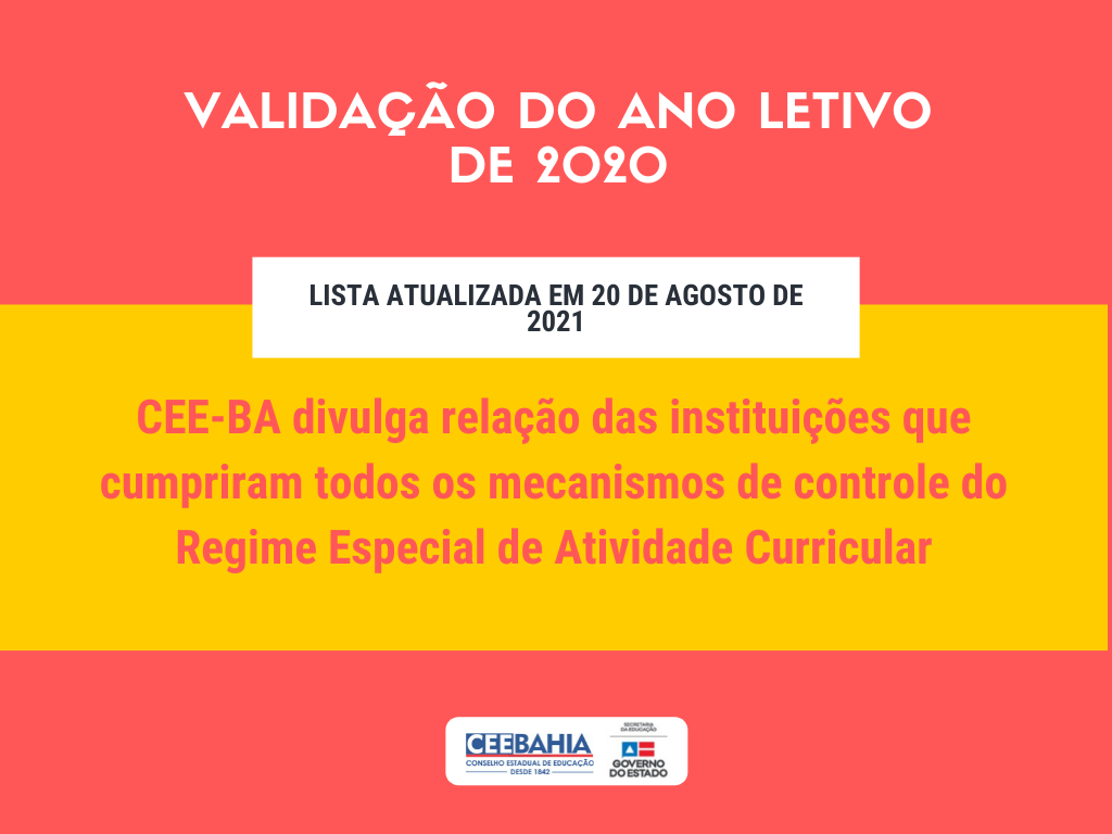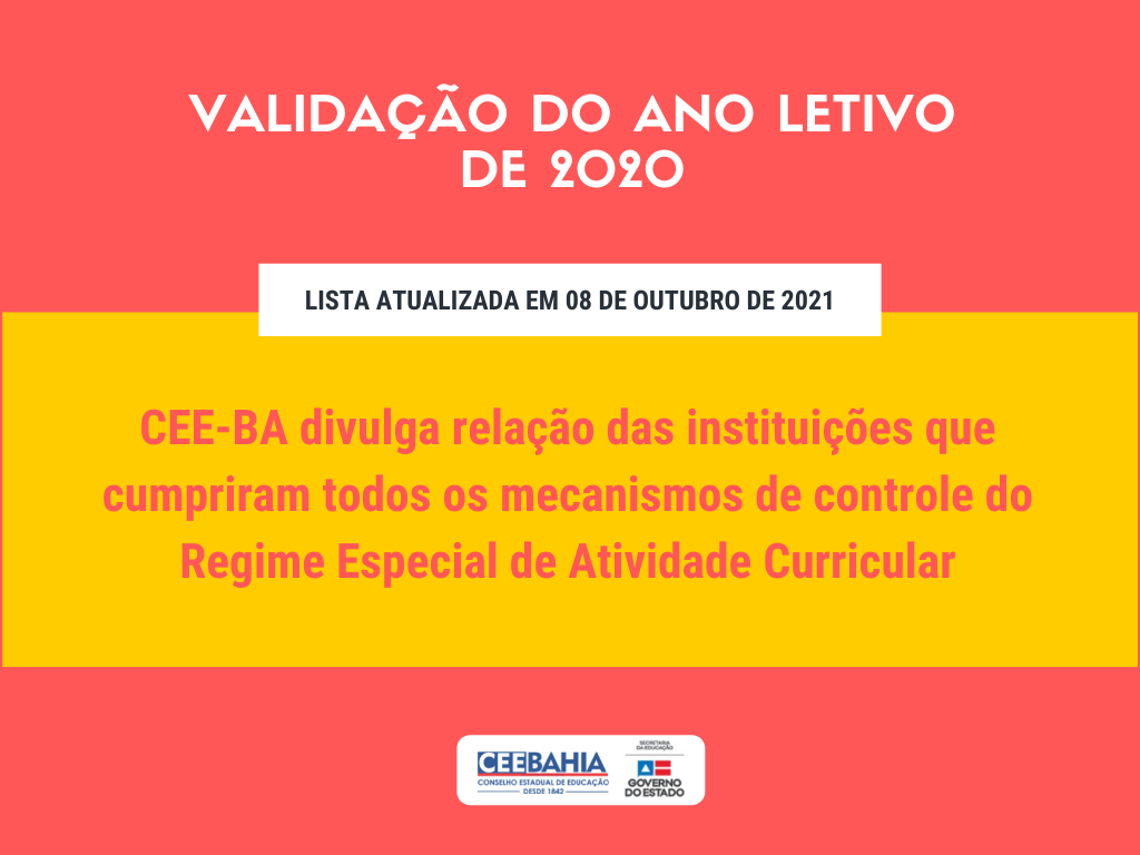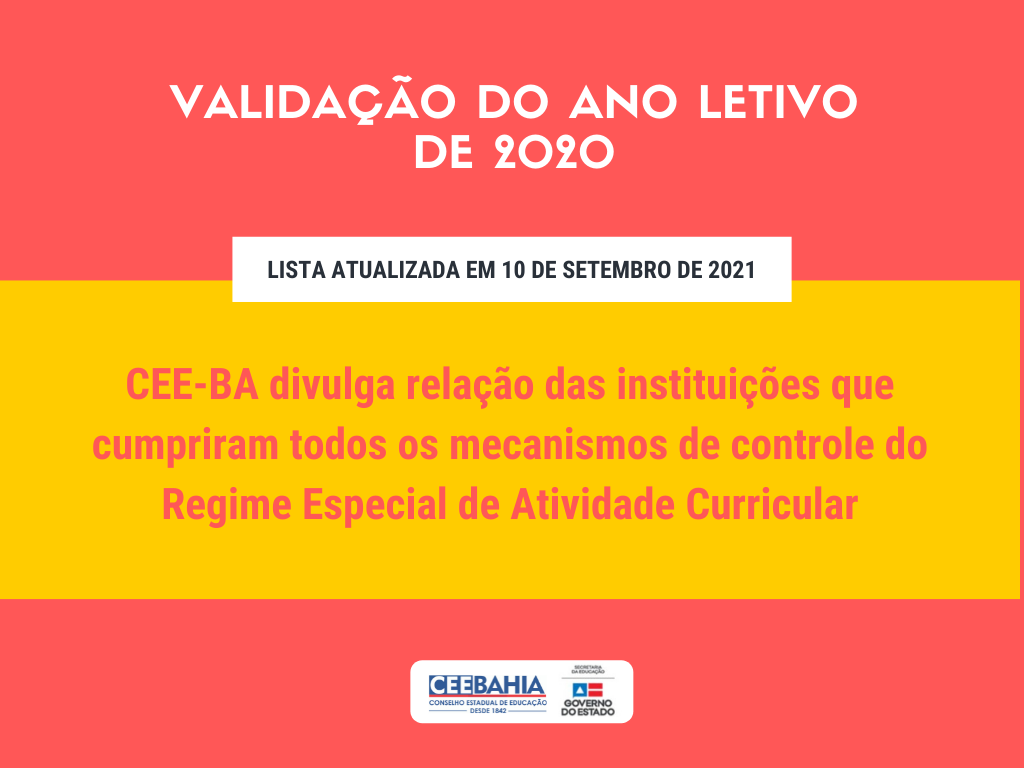 O Conselho Estadual de Educação da Bahia (CEE-BA) iniciou a publicação das listas de validação do ano letivo de 2020, com as instituições que cumpriram todos os mecanismos de controle do Regime Especial de Atividade Curricular.