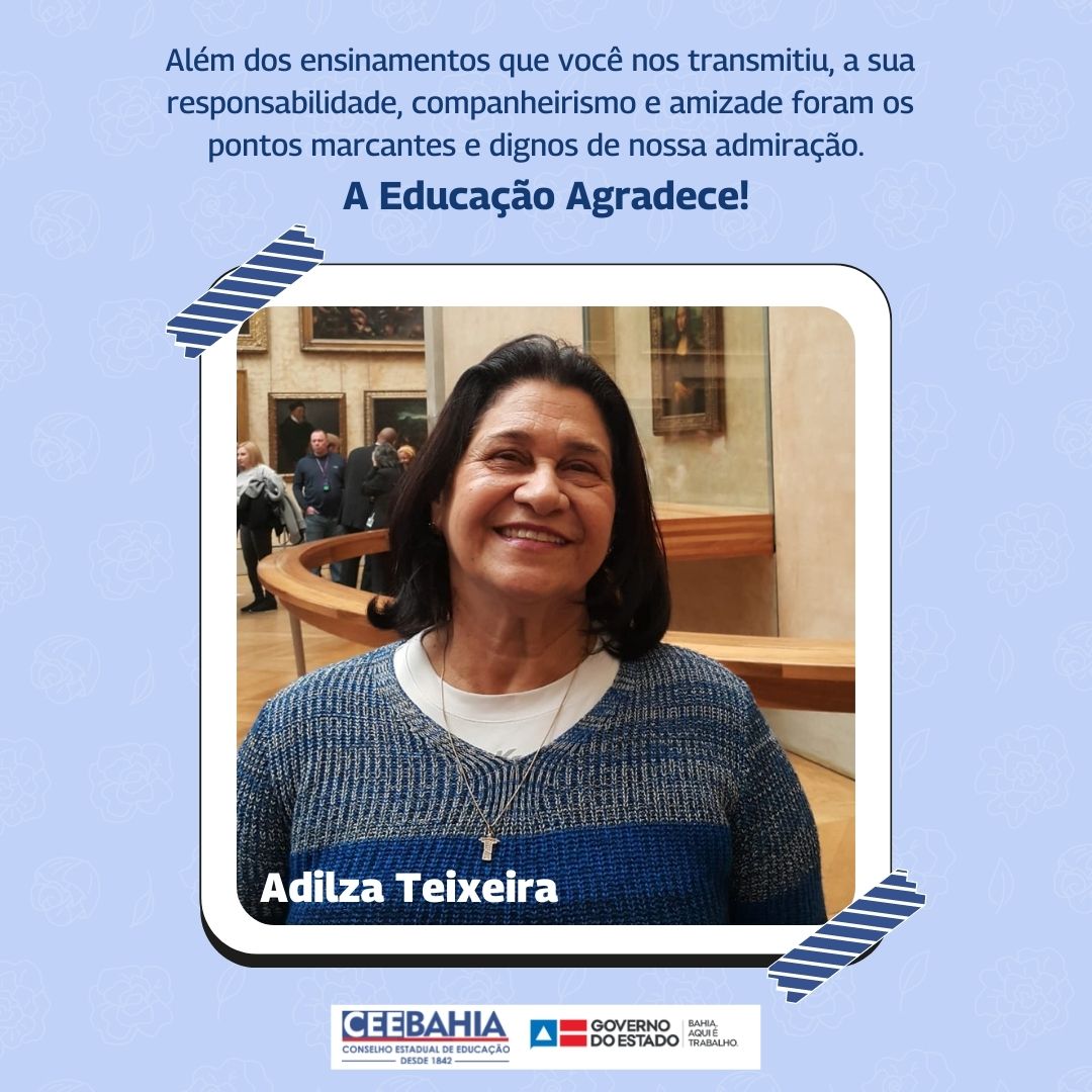 O Conselho Estadual de Educação da Bahia (CEE-BA) parabeniza a professora Adilza Teixeira pela sua aposentadoria, publicada no Diário Oficial do Estado (DOE) desta quinta-feira (14), e agradece toda dedicação em prol da educação baiana.