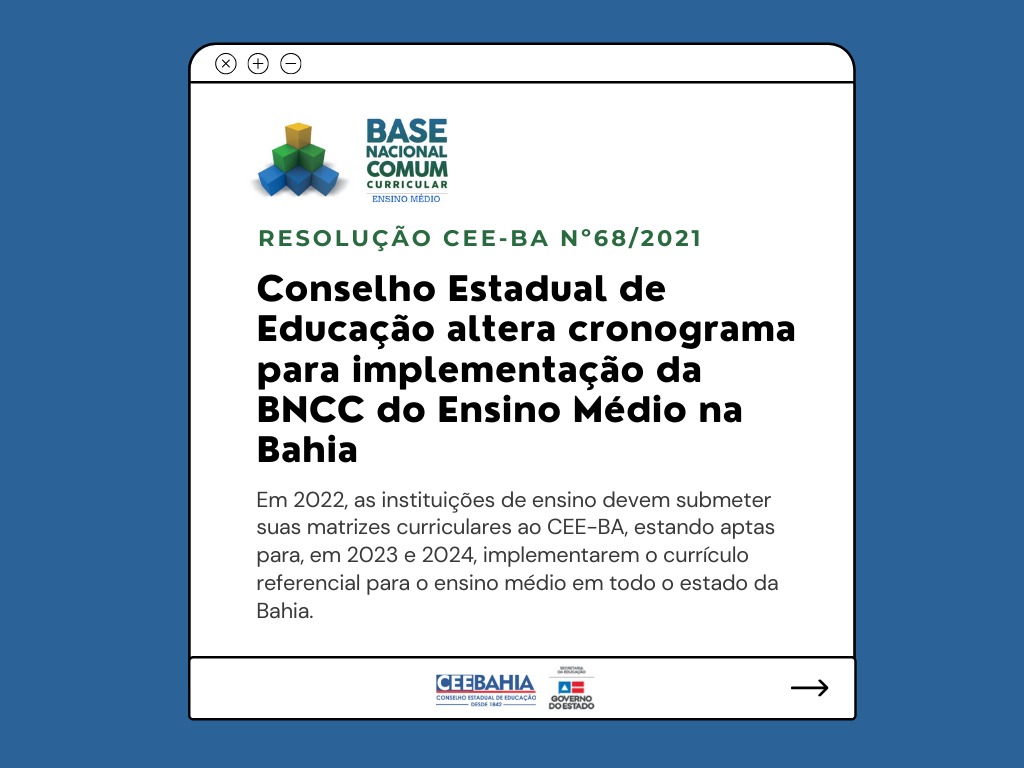 O Conselho Estadual de Educação da Bahia (CEE-BA) publicou no Diário Oficial do Estado (DOE) desta sexta-feira, 22 de outubro de 2021, a Resolução de Nº 68 que altera o art. 21 da Resolução Nº 137, de 17 de dezembro de 2019. A Normativa estabelece novo cronograma para a implementação do Documento Curricular Referencial da Bahia (DCRB) do Ensino Médio, que tem como base as orientações normativas da Base Nacional Comum Curricular (BNCC), no sistema estadual de ensino de toda a Bahia.
