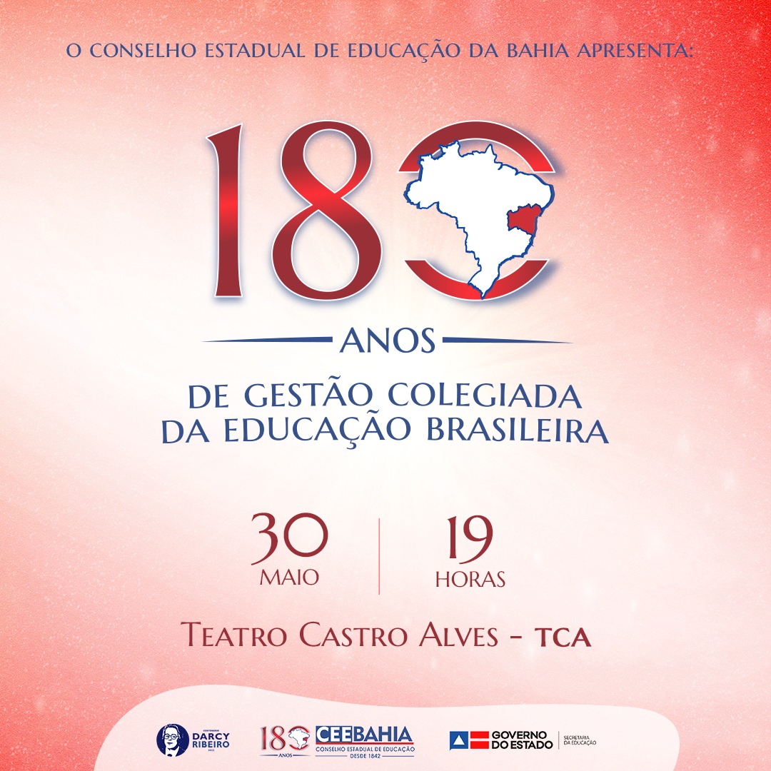 No dia 30 de maio, a partir das 19 horas, o Conselho Estadual de Educação da Bahia (CEE-BA), órgão colegiado vinculado à Secretaria da Educação do Estado, realizará a Conferência Nacional ‘180 Anos de Gestão Colegiada da Educação Brasileira”, no Teatro Castro Alves (TCA).