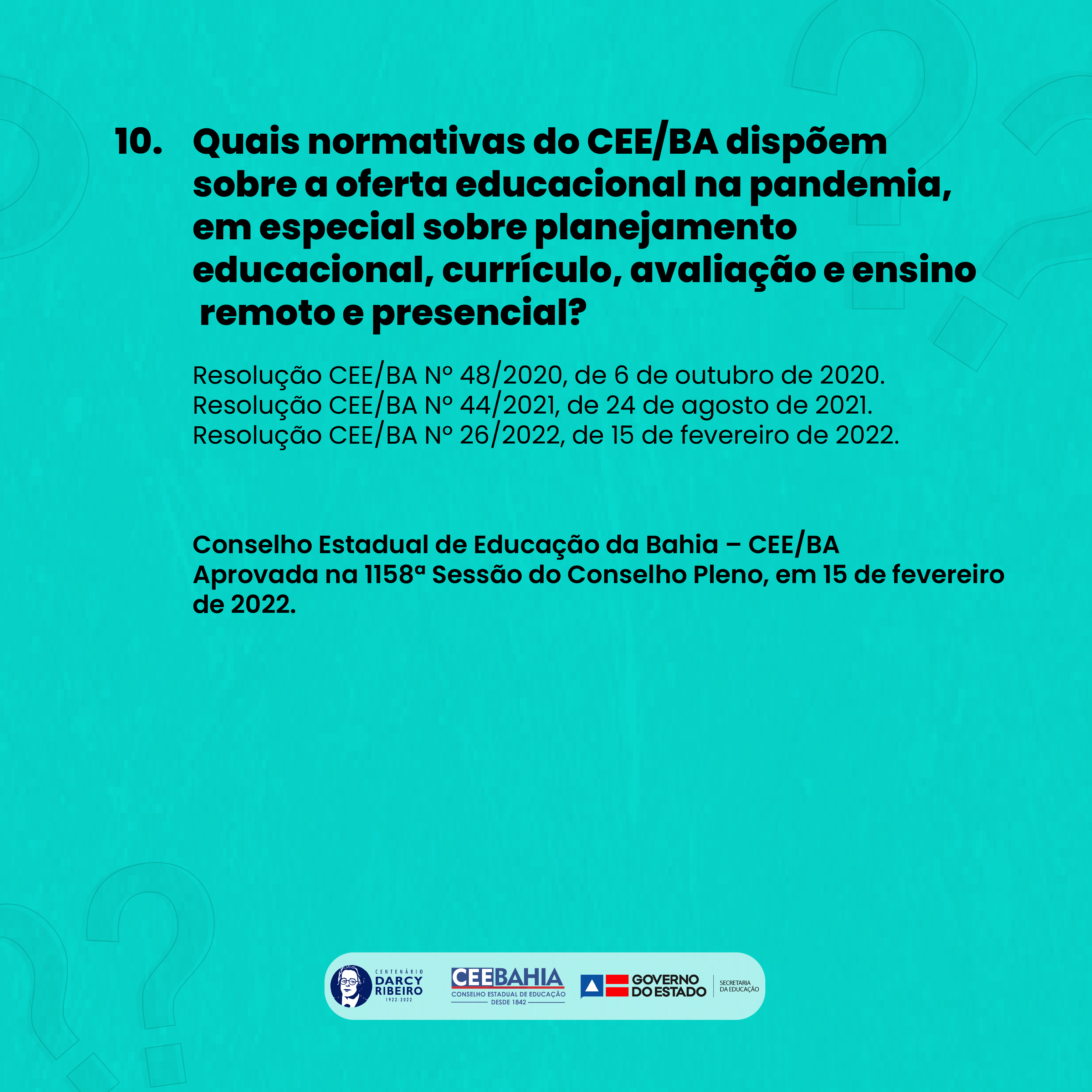 10.     Quais normativas do CEE/BA dispõem sobre a oferta educacional na pandemia, em especial sobre planejamento educacional, currículo, avaliação e ensino remoto e presencial?