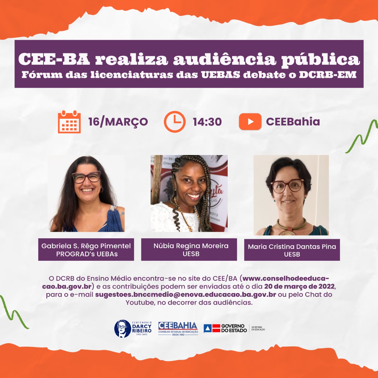 O Conselho Estadual de Educação da Bahia (CEE/BA) promove, na próxima quarta-feira (16), às 14h30min, a terceira audiência pública sobre o Documento Curricular Referencial da Bahia (DCRB), etapa Ensino Médio. O encontro contará com a participação da Pró-Reitora de Graduação da UNEB, Gabriela Sousa Rêgo; da professora do PPGED-UESB, Núbia Regina, e da professora do Curso de História/PPGED e representante do Fórum das Licenciaturas da UESB, Maria Cristina Dantas Pina.