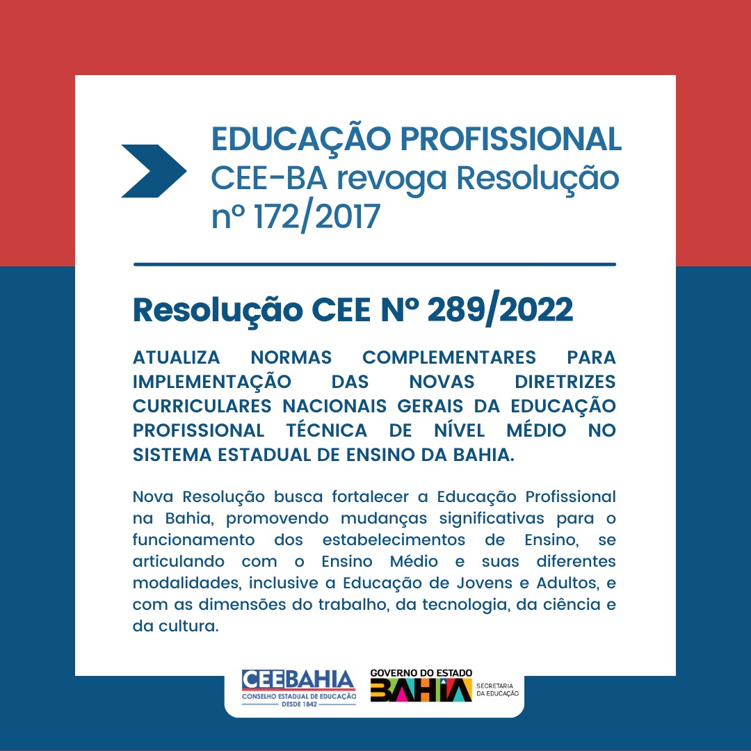 O Conselho Estadual de Educação da Bahia (CEE-BA) revogou a Resolução nº 172/2017, que tratava das diretrizes para a Educação Profissional Técnica de Nível Médio no Sistema Estadual de Ensino da Bahia. A medida foi tomada diante da nova Resolução do Conselho nº 289/2022, que foi publicada no Diário Oficial do Estado (DOE) desta quinta-feira, 15 de junho de 2023, e estabelece novas diretrizes e promove mudanças significativas para o funcionamento dos estabelecimentos de Ensino, se articulando com o Ensino Médio e suas diferentes modalidades, inclusive a Educação de Jovens e Adultos (EJA), e com as dimensões do trabalho, da tecnologia, da ciência e da cultura.