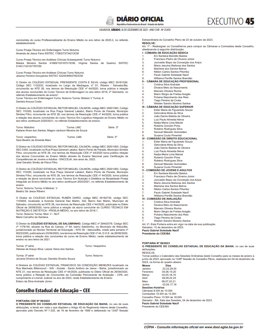 Os membros titulares do Conselho Estadual de Educação da Bahia (CEE-BA) entram em recesso nessa quarta (20), e só retornam no dia 22 de janeiro de 2024, de acordo com o calendário de sessões plenárias aprovado para o primeiro semestre do ano de 2024. As reuniões nas Câmaras e Comissões também serão suspensas, com início na mesma data.