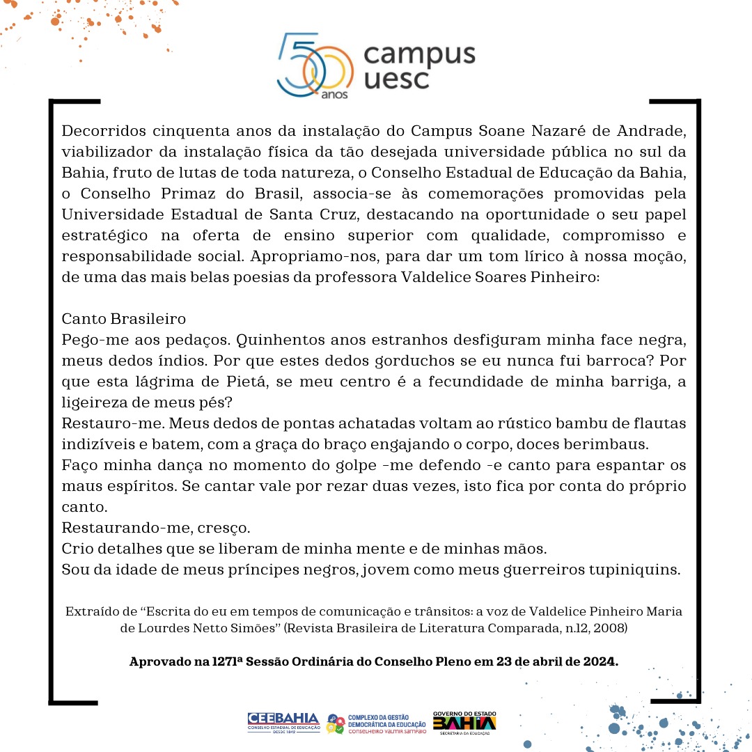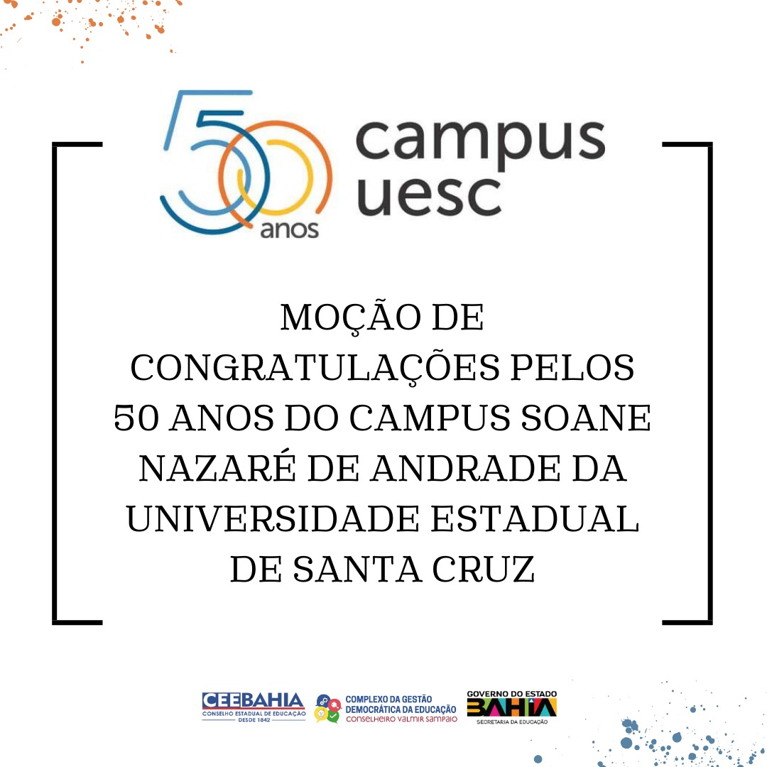 Decorridos cinquenta anos da instalação do Campus Soane Nazaré de Andrade, viabilizador da instalação física da tão desejada universidade pública no sul da Bahia, fruto de lutas de toda natureza, o Conselho Estadual de Educação da Bahia, o Conselho Primaz do Brasil, associa-se às comemorações promovidas pela Universidade Estadual de Santa Cruz, destacando na oportunidade o seu papel estratégico na oferta de ensino superior com qualidade, compromisso e responsabilidade social.
