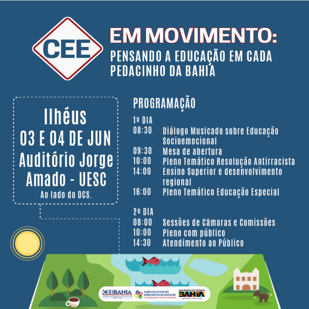 O ‘CEE em Movimento - Pensando a Educação em cada Pedacinho da Bahia’ é uma iniciativa do Conselho Estadual de Educação da Bahia (CEE-BA) para descentralizar as atividades e fortalecer a educação no Estado. Com o objetivo de assegurar que todas as regiões do estado tenham uma participação equitativa nas decisões educacionais, o evento percorrerá cinco municípios: Ilhéus, Vitória da Conquista, Feira de Santana, Amargosa e Senhor do Bonfim, entre junho e setembro de 2024, para debater sobre educação antirracista, inclusiva e pautas educacionais de cada localidade.