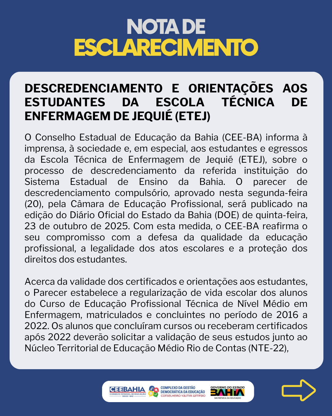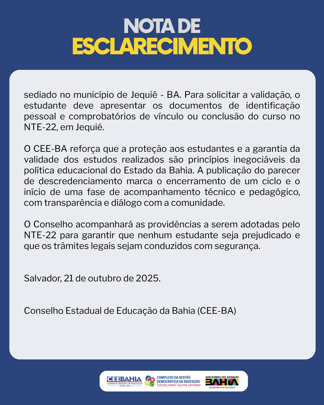 O Conselho Estadual de Educação da Bahia (CEE-BA) informa à imprensa, à sociedade e, em especial, aos estudantes e egressos da Escola Técnica de Enfermagem de Jequié (ETEJ), sobre o processo de descredenciamento da referida instituição do Sistema Estadual de Ensino da Bahia. O parecer de descredenciamento compulsório, aprovado nesta segunda-feira (20), pela Câmara de Educação Profissional, será publicado na edição do Diário Oficial do Estado da Bahia (DOE) de quinta-feira, 23 de outubro de 2025. Com esta medida, o CEE-BA reafirma o seu compromisso com a defesa da qualidade da educação profissional, a legalidade dos atos escolares e a proteção dos direitos dos estudantes.