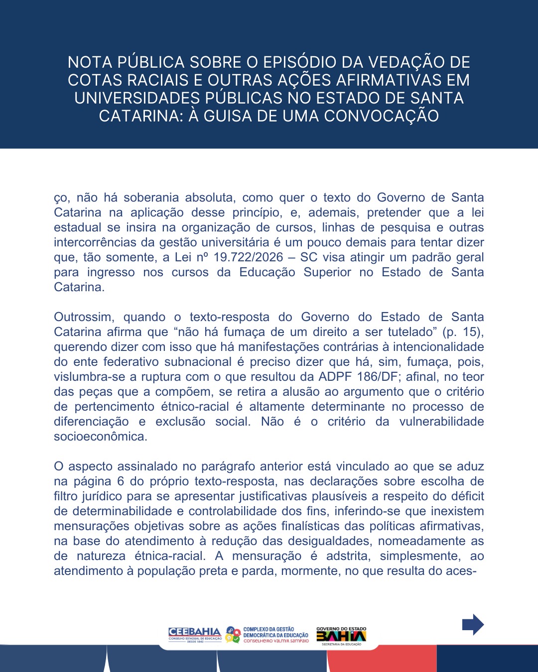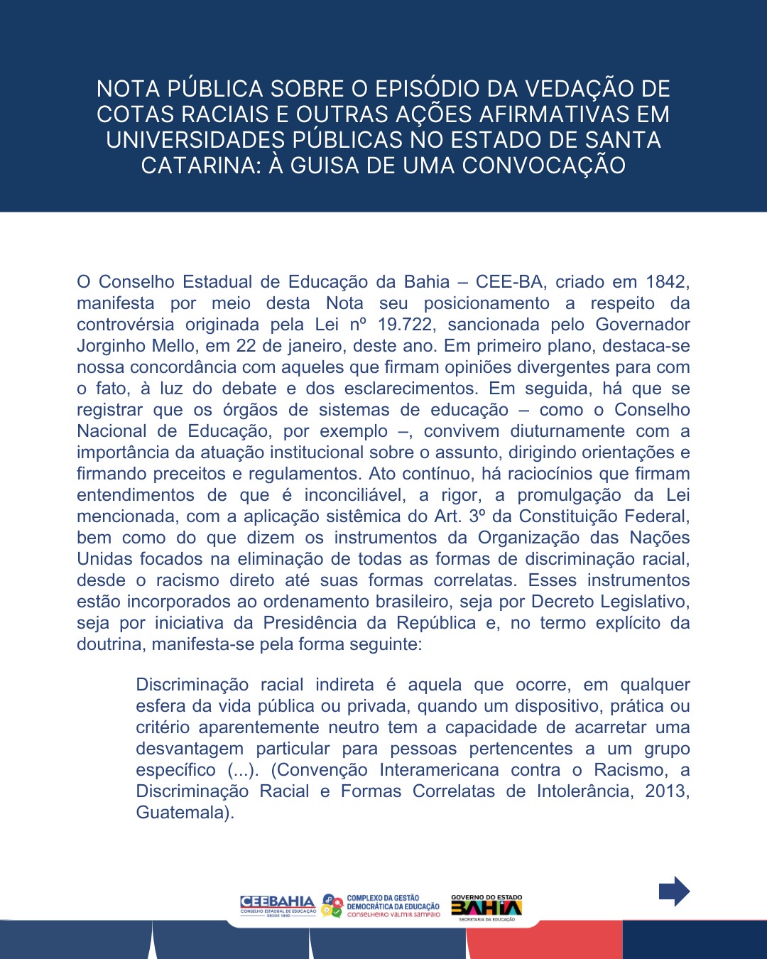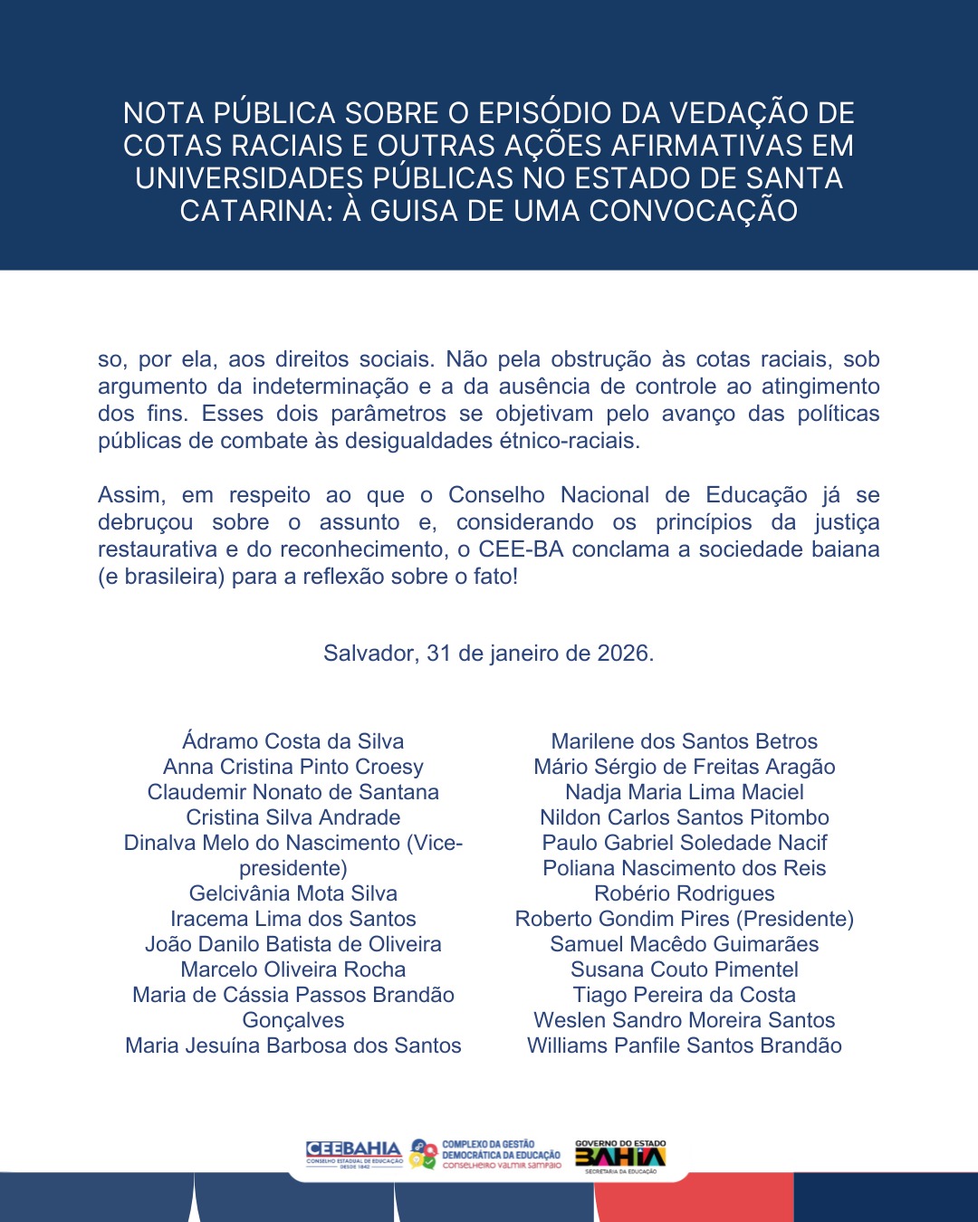 O Conselho Estadual de Educação da Bahia – CEE-BA, criado em 1842, manifesta por meio desta Nota seu posicionamento a respeito da controvérsia originada pela Lei nº 19.722, sancionada pelo Governador Jorginho Mello, em 22 de janeiro, deste ano. Em primeiro plano, destaca-se nossa concordância com aqueles que firmam opiniões divergentes para com o fato, à luz do debate e dos esclarecimentos. Em seguida, há que se registrar que os órgãos de sistemas de educação – como o Conselho Nacional de Educação, por exemplo –, convivem diuturnamente com a importância da atuação institucional sobre o assunto, dirigindo orientações e firmando preceitos e regulamentos. Ato contínuo, há raciocínios que firmam entendimentos de que é inconciliável, a rigor, a promulgação da Lei mencionada, com a aplicação sistêmica do Art. 3º da Constituição Federal, bem como do que dizem os instrumentos da Organização das Nações Unidas focados na eliminação de todas as formas de discriminação racial, desde o racismo direto até suas formas correlatas. Esses instrumentos estão incorporados ao ordenamento brasileiro, seja por Decreto Legislativo, seja por iniciativa da Presidência da República e, no termo explícito da doutrina, manifesta-se pela forma seguinte: