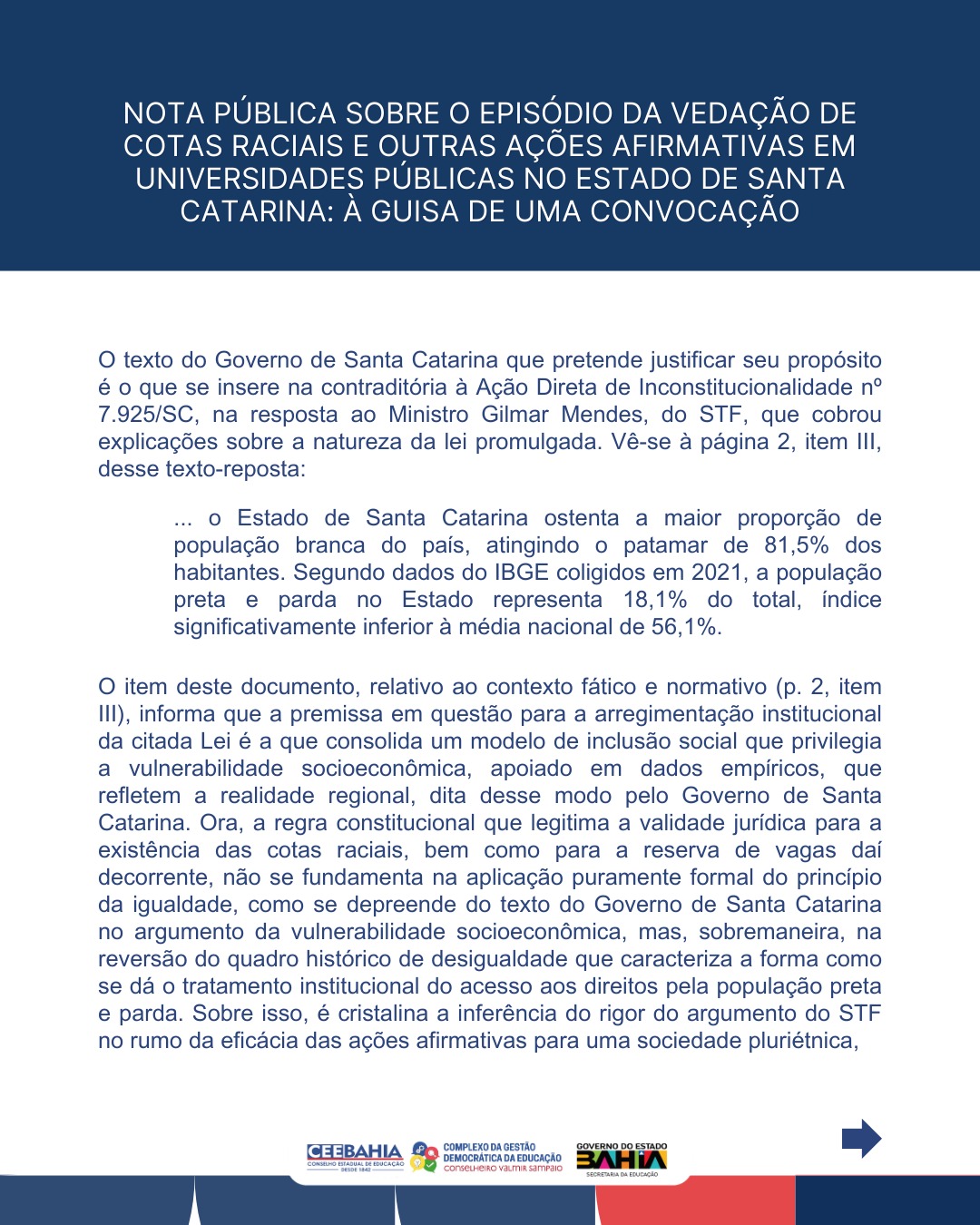 O item deste documento, relativo ao contexto fático e normativo (p. 2, item III), informa que a premissa em questão para a arregimentação institucional da citada Lei é a que consolida um modelo de inclusão social que privilegia a vulnerabilidade socioeconômica, apoiado em dados empíricos, que refletem a realidade regional, dita desse modo pelo Governo de Santa Catarina. Ora, a regra constitucional que legitima a validade jurídica para a existência das cotas raciais, bem como para a reserva de vagas daí decorrente, não se fundamenta na aplicação puramente formal do princípio da igualdade, como se depreende do texto do Governo de Santa Catarina no argumento da vulnerabilidade socioeconômica, mas, sobremaneira, na reversão do quadro histórico de desigualdade que caracteriza a forma como se dá o tratamento institucional do acesso aos direitos pela população preta e parda. Sobre isso, é cristalina a inferência do rigor do argumento do STF no rumo da eficácia das ações afirmativas para uma sociedade pluriétnica, para além da sua constitucionalidade. Fora disso, o que se vislumbra é contemplação tácita do racismo estrutural. Sendo assim, não importa a configuração dos estratos demográficos na composição da realidade regional, mas, sobretudo, a reversão da desigualdade, historicamente imposta à população preta e parda, nas múltiplas decorrências da ordem escravagista. Ademais, capta-se outro imbróglio argumentativo do texto-resposta do Governo de Santa Catarina, quando, ao falar da autonomia universitária (p. 15, item IV.2.7), assim se pronuncia: