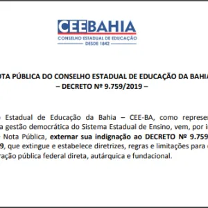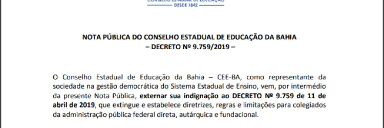 NOTA PÚBLICA DO CONSELHO ESTADUAL DE EDUCAÇÃO DA BAHIA<br>– DECRETO Nº 9.759/2019