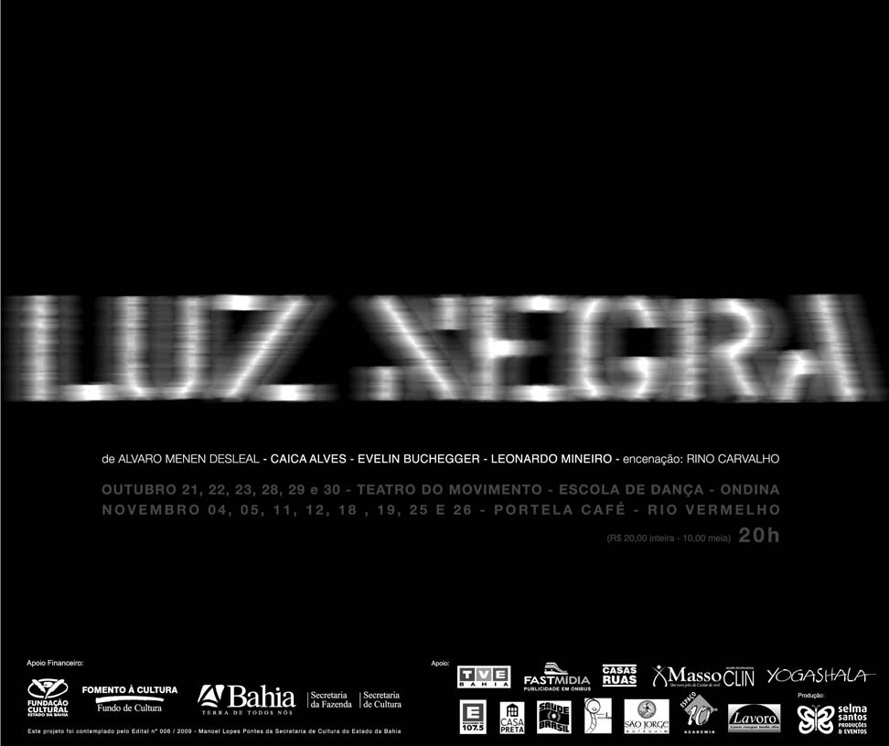 Uma tentativa desesperada de compreender a crueldade e a insensibilidade dos homens é a tônica da peça “Luz Negra”, texto premiado do dramaturgo salvadorenho Alvaro Menen Desleal (1931-2000), encenado em dezenas de países e em vários idiomas, desde a sua estreia em 1964. Uma nova montagem desse relato fantástico, sob a direção de Rino Carvalho e com os atores Caica Alves, Evelin Buchegger e Leonardo Mineiro, estreia no próximo dia 28, quinta-feira, no Teatro do Movimento (Escola de Dança da UFBA, em Ondina), e ficará em cartaz até 30 de outubro, às quintas, sextas e sábados, às 20 horas. Em novembro, o espetáculo será levado ao Portela Café (Parque Cruz Aguiar, no Rio Vermelho), às quintas e sextas, no mesmo horário. Ingressos R$ 20,00 (inteira).