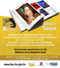 No dia 8 de junho (quarta-feira), às 15h, a Biblioteca Juracy Magalhães Júnior, no Rio Vermelho receberá a dramaturga, diretora de teatro e contista Adelice Souza, para participar do projeto Encontro com o Escritor, da Fundação Pedro Calmon/SecultBA. Na ocasião, a escritora discorrerá sobre sua carreira literária e sua vivência no universo das letras e do teatro.