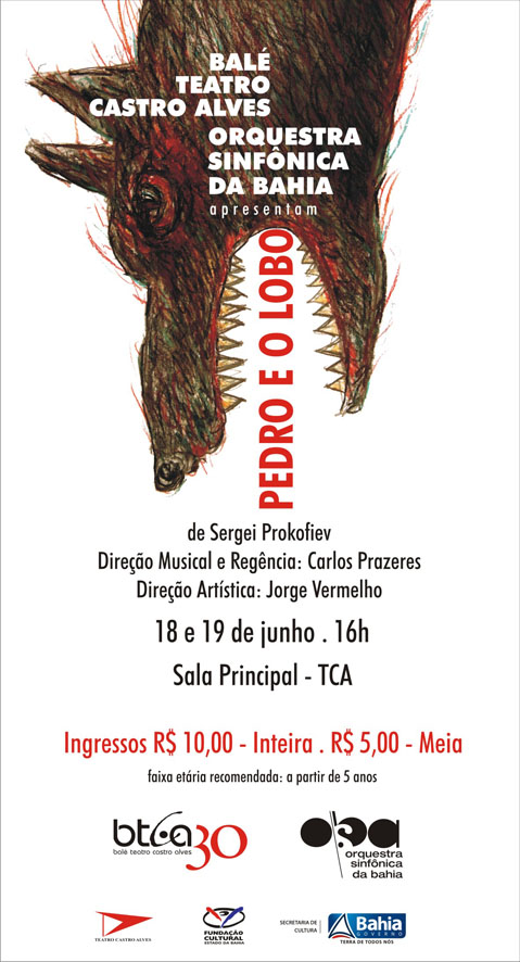 A nova montagem proporciona o reencontro dos dois corpos estáveis do TCA e faz apenas duas apresentações a preços populares nos próximos dias 18 e 19 de junho. A fábula musical "Pedro e o Lobo", do compositor russo Sergei Prokofiev, ganha a sua mais nova versão ao reunir no mesmo palco o Balé Teatro Castro Alves (BTCA), com a direção artística deJorge Vermelho, e a Orquestra Sinfônica da Bahia (OSBA), sob a regência do maestro Carlos Prazeres. O espetáculo, indicado para todas as idades, estreia no próximo dia 18 de junho, sábado, às 16 horas, naSala Principal do TCA, com mais uma apresentação no domingo, dia 19 de junho, no mesmo horário.Os ingressos custam R$ 10,00 (inteira)R$ 5,00 (meia). Na véspera da estreia, no dia 17 de junho, sexta-feira, acontece ainda um ensaio aberto ao público (entrada gratuita), também às 16 horas. A montagem de "Pedro e o Lobo" é a primeira coreografia do BTCA voltada para o público infanto-juvenil em seus 30 anos de existência. A MONTAGEM – O diretor Jorge Vermelho assina a cenografia e Rino Carvalho assina o figurino, que juntos dão o tom da encenação, onde os animais/personagens da fábula são interpretados pelo elenco de uma forma que esta construção não resvale em estereótipos. Para isso o BTCA encampou um processo de investigação que foi acompanhado pelo seu próprio Núcleo de Pesquisa e teve a coordenação de Lícia Morais. “Foi através deste trabalho que emergiram as provocações que delinearam a construção das personagens, alicerçadas no humanismo das mesmas”, conta Vermelho. A montagem pretende dialogar com o universo fantástico da criação por meio de ferramentas que possibilitem a livre imaginação, inserindo-a ativamente no processo de entendimento da obra. A HISTÓRIA – Pedro e o lobo é uma história infantil contada através da música. A narrativa, divertida e sensível, gira em torno de Pedro, um menino que cansa de ver suas ovelhas serem mortas pelo lobo mau e, contra a vontade de seu avô, decide ir à caça do lobo com sua espingarda de rolha. Para essa aeventura ele tem a companhia de seu gato Ivan, sua pata Sônia, e da passarinha Sasha, que são seus grandes amigos. Cada personagem da história é representado por um instrumento diferente ou por um conjunto de instrumentos que compõem a orquestra: Pedro (instrumentos de corda); Lobo (trompas); Avô (fagote); Pássaro (flauta); Pato (oboé); Gato (clarinete); Caçadores (tímpanos). Ficha técnica: Concepção, adaptação, cenografia e direção artística: Jorge Vermelho; Direção musical: Carlos Prazeres (OSBA); Coreografias: Angela Bandeira, Dina Tourinho, Fátima Berenguer, José Antonio Sampaio, Luis Molina e Rita Brandi; Figurinos e adereços: Rino Carvalho Iluminação: Irma Vidal e Jorge Vermelho; Apoio: Centro Técnico do TCA ATENÇÃO - Os ingressos começam a ser vendidos a partir de hoje, 09/06, na bilheteria do TCA, SAC Shopping Barra e SAC Shopping Iguatemi. Garanta já o seu ingresso. Mais informações: 3117-4899 (Bilheteria) / 3117-4832 (Ascom) ou acesse: www.tca.ba.gov.br