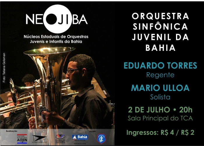 No dia 2 de julho, a Orquestra Sinfônica Juvenil da Bahia (YOBA), se apresenta sob regência do maestro Eduardo Torres na Sala Principal do Teatro Castro Alves, para celebrar a Independência da Bahia. O concerto, que antecipa a turnê internacional na Alemanha e Suíça, nos dias 5 e 7 de agosto, respectivamente, poderá ser conferido em Salvador a preços populares: R$ 4,00 e R$ 2,00. Se apresentando pela primeira vez com a Sinfônica Juvenil da Bahia, o solista do concerto será o violonista costa-riquenho Mario Ulloa, com o Adagio do "Concerto de Aranjuez para violão e orquestra”, de Joaquin Rodrigo. Radicado na Bahia, Mario Ulloa já se apresentou como solista na Inglaterra, Alemanha, Áustria, Holanda, Noruega, França, Bélgica, Canadá e Estados Unidos, e gravou quatro CDs. Em maio deste ano, a YOBA foi a primeira orquestra brasileira a se apresentar em uma das mais importantes salas de espetáculo da Europa – o Royal Festival Hall, em Londres. Em agosto, a Orquestra parte para mais concertos inéditos: no dia 05, será a primeira orquestra juvenil brasileira a se apresentar no Festival Young Euro Classic, na abertura do evento, em Berlim. Em seguida, a Orquestra viaja a Genebra, onde se apresenta no Victoria Hall, no dia 07 de agosto, como parte da programação do “Musiques en Été” (Músicas no Verão). O Festival é organizado anualmente pelo Departamento de Assuntos Culturais da Cidade de Genebra, com uma série anual de concertos para os amantes da música. Confira um trecho da apresentação da YOBA no Royal Festival Hall, em Londres, ao lado do pianista Lang Lang: SERVIÇO Orquestra Sinfônica Juvenil da Bahia Onde: Sala Principal do Teatro Castro Alves Quando: Sábado, 2 de Julho, às 20h Quanto: R$ 4 (inteira) PROGRAMA JOSÉ DOS SANTOS BARRETO Hino ao 2 de Julho (Arr. Fred Dantas) FRANZ LISZT Les Préludes JOAQUÍN RODRIGO Adagio do "Concerto de Aranjuez" Solista: Mario Ulloa (violão) HEITOR VILLA-LOBOS Miudinho (Dança - Bachianas Brasileiras n° 4) WELLINGTON GOMES Sonhos Percutidos SILVESTRE REVUELTAS Sensemayá