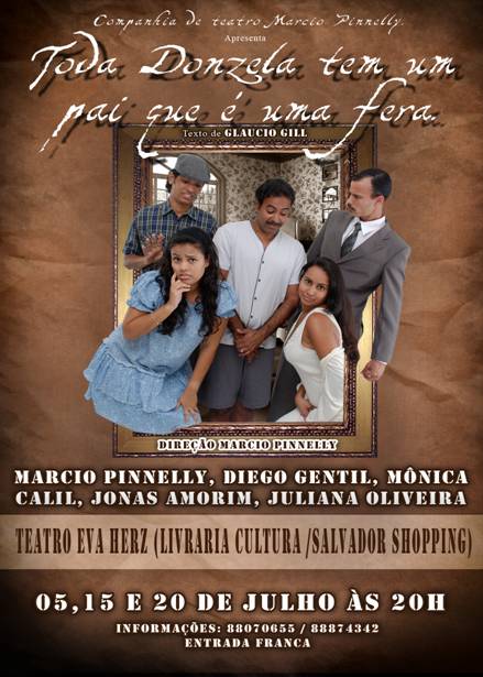 Dayse, filha de um general linha dura, vai morar com seu namorado Joãozinho. O pai descobre, fica uma fera e vai armado atrás do rapaz. Desesperado, o moço procura seu grande amigo Porfírio, que mora no mesmo prédio e lhe pede que Dayse fique lá por alguns minutos. Após vasculhar o apartamento de Joãozinho e não encontrar a filha, o general descobre que a moça está no apartamento de Porfírio, um libertino. Baseado em um dos textos mais famosos de Gláucio Gil, a peça "Toda donzela tem um Pai que é uma fera" é dirigido e atuado por Marcio Pinnelly, e conta também em seu elenco com os atores Diego Gentil, Jonas Amorim, Juliana Oliveira e Mônica Calil. A montagem está em cartaz no Teatro Eva Herz em curta temporada. Serviço Quando: 05, 15 e 20/07 Horário: às 20 horas Local: Teatro Eva Herz, Livraria Cultura do Salvador Shpping Ingressos: Entrada franca. Será disponibilizada uma senha nos caixas da livraria O espetáculo segue em cartaz no período abaixo: Agosto: dia 07 (domingo) às 19 horas dia 21 (domingo) 19 horas dia 29 (segunda) 20 horas Setembro: dia 20 (terça) 20 horas dia 21 (quarta) 20 horas dia 30 (sexta) 20 horas