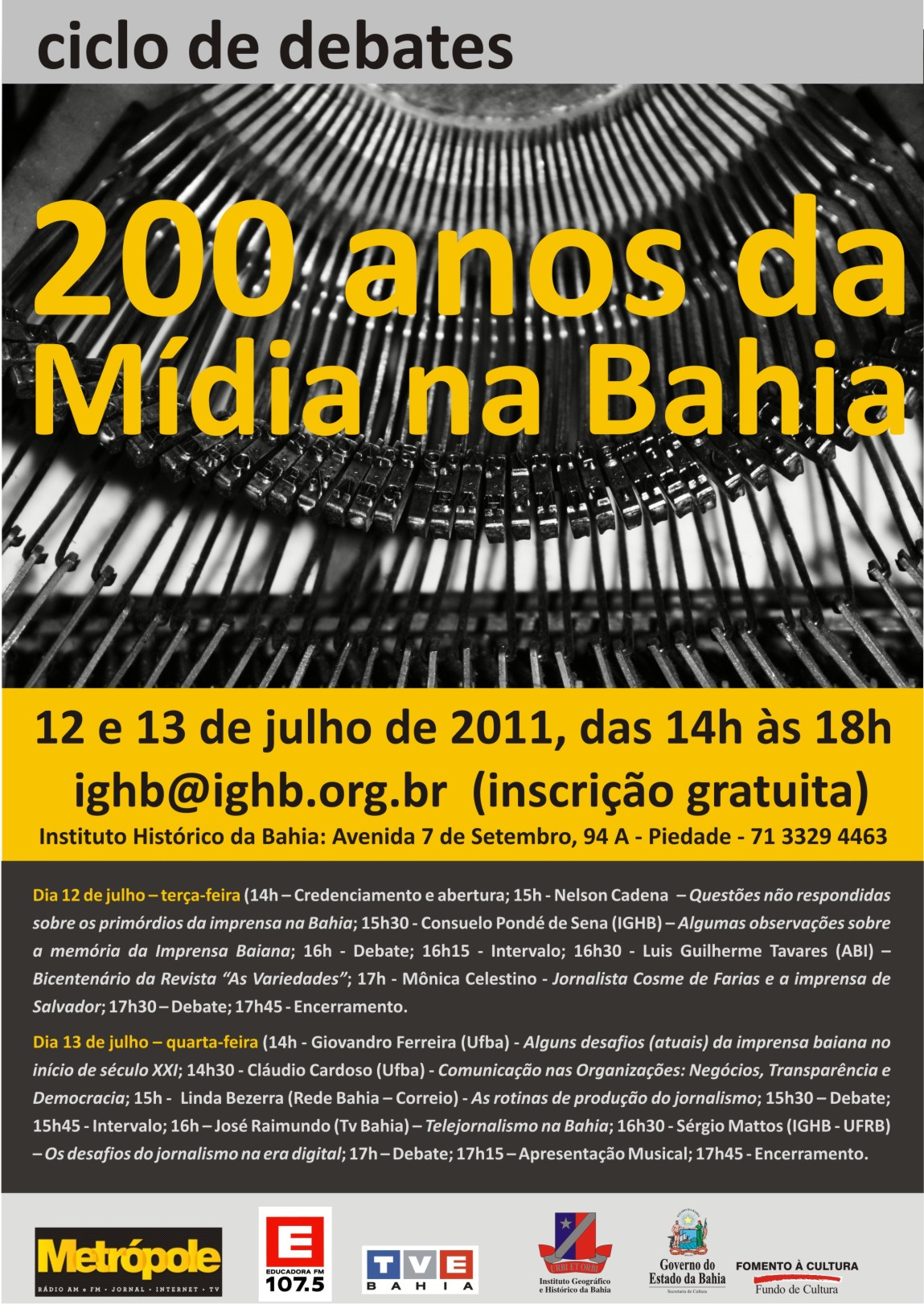 Entre os dias 12 e 13 de julho (terça e quarta-feira), das 14h às 18h, o Instituto Geográfico e Histórico (IGHB) reúne especialistas, professores, estudantes e interessados para debater os 200 anos da Mídia na Bahia. O encontro faz parte das comemorações do bicentenário na imprensa, iniciadas em maio deste ano, até janeiro de 2012, quando se rememorará os 200 anos da revista As Variedades ou Ensaios de Literatura, considerada pelos estudiosos da história da imprensa brasileira como a primeira revista publicada em território nacional.