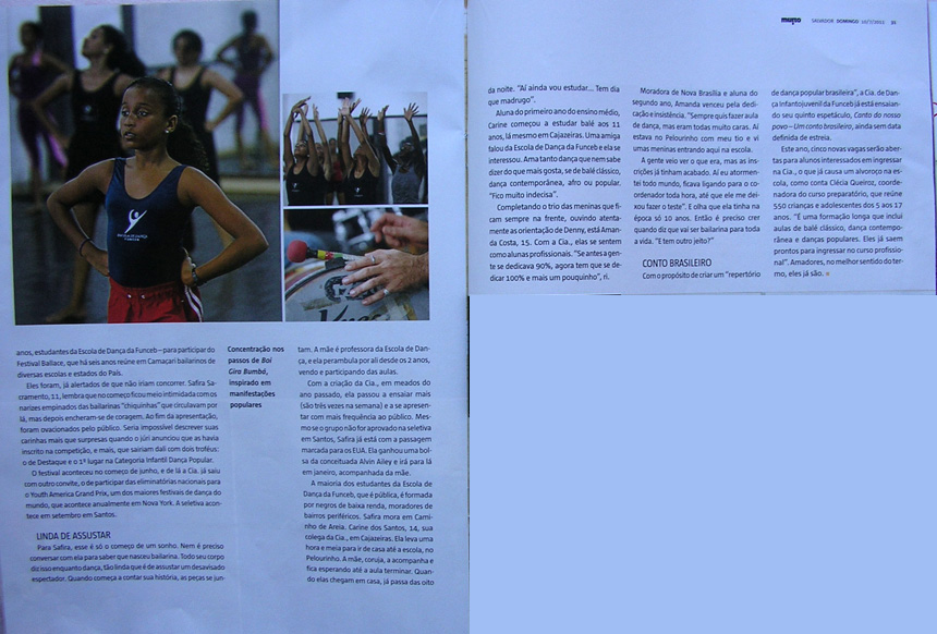 Com a criação da Cia., em meados do ano passado, ela passou a ensaiar mais (são três vezes na semana) e a se apresentar com mais freqüência ao público. Mesmo se o grupo não for aprovado na seletiva em Santos, Safira já está com a passagem marcada para os EUA. Ela ganhou uma bolsa da conceituada Alvin Ailey e irá para lá em janeiro, acompanhada da mãe.