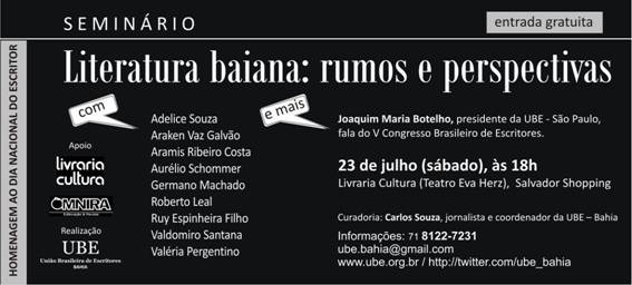 Em julho comemora-se o Dia Nacional do Escritor. Para homenagear os Artistas da Palavra, a União Brasileira de Escritores – UBE, núcleo Bahia realizará no dia 23 de julho (sábado), das 18h às 21h, na Livraria Cultura (TEATRO EVA HERZ), em Salvador, o seminário Literatura baiana: rumos e perspectivas, com a participação de escritores e editores baianos.