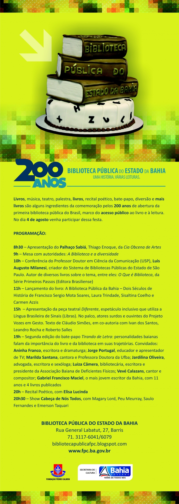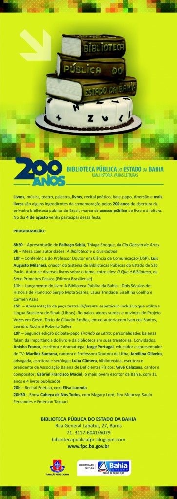 No próximo dia 4 de agosto, a primeira biblioteca do Brasil e da América Latina, a Biblioteca Pública do Estado da Bahia (BPEB) comemora 200 anos de acesso público ao livro e da leitura no país. Celebrando esta data, a unidade promoverá durante todo o dia uma programação gratuita e diversificada que inclui uma serie de atividades como apresentações teatrais, músicas, palestra, um recital poético com Elisa Lucinda, bate-papo com artistas e personalidades, lançamento de livro sobre o bicentenário da Biblioteca e um show reunindo nomes como Magary Lord, Peu Meurray, Saulo Fernandes, Larissa Luz e convidados. Criada em sessão solene e simbólica no dia 13 de maio de 1811, a Biblioteca Pública do Estado da Bahia só foi aberta ao público no dia 4 de agosto do mesmo ano com o nome de “Livraria Pública da Bahia”. Atualmente conta com um acervo de 600 mil exemplares, sendo 150 mil livros e diversos setores como o Braille, Periódicos, Documentação Baiana, Infanto-juvenil, Artes, Empréstimo, Pesquisa/Referência, Audiovisual e Obras Raras e Valiosas, recebendo diariamente centenas de pesquisadores e interessados pelo universo dos livros e pela rica programação cultural e artística. Diversidade. Essa é a palavra-chave dos assuntos que serão abordados na comemoração dos 200 anos da Biblioteca Pública do Estado da Bahia. Além de possuir um vasto acervo, a Biblioteca realiza mensalmente uma série de ações culturais com o objetivo de atender a todos os públicos, respeitando e convivendo com as diferenças de cada usuário. Segundo a diretora do Sistema de Bibliotecas Públicas (DIBIP), Ivanise Tourinho, esta celebração do Bicentenário reafirma uma das características fundamentais de uma biblioteca pública, que é ser um equipamento plural, democrático, inclusivo e popular. “São duzentos anos de relevância, fomentando a cultura e o gosto pela leitura. Aqui a diversidade sobressai, pois possuímos setores que respeitam a acessibilidade e atende ao gosto do público adulto e infanto-juvenil”, destacou a bibliotecária, que ainda convocou a população para participar da celebração: “Que o olhar de todos estejam voltados para a Biblioteca no dia 4 de agosto, pois estaremos de portas abertas para recebê-los”, convidou. A programação cultural se estenderá por todo o dia 4 de agosto, iniciando às 8h30 com a apresentação do Palhaço Sabiá, personagem do ator Thiago Enoque, da Cia Obcena de Artes. Às 9h o evento contará com a mesa de abertura onde estarão presentes: o secretário de Cultura de Estado, Albino Rubim, o diretor da Fundação Pedro Calmon, Ubiratan Castro de Araújo, a diretora do Sistema de Bibliotecas Públicas, Ivanise Tourinho, a diretora da Biblioteca Pública do Estado da Bahia, Kilma Alves; a presidente do Conselho Regional de Biblioteconomia 5ª Região, Lucimar Silva e a deputada federal, Alice Portugal, que integra a Comissão de Educação e Cultura da Câmara Federal. Às 10h, acontecerá o lançamento do livro Biblioteca Pública do Estado da Bahia: 200 anos, escrito por Francisco Mota, Laura Trindade, Sisaltina Coelho e Carmem Aziz. O livro conta a história da primeira biblioteca pública do Brasil, que nesses 200 anos mudou de endereço seis vezes, já possuiu a maioria do acervo em língua francesa, se renovou e transformou o seu espaço antes dedicado somente para a leitura e pesquisa, em um ambiente de convivência. A história da Biblioteca, revelada no livro, reforça a importância da unidade como um rico patrimônio cultural do Brasil. O Professor Doutor em Ciência da Comunicação (USP), criador do Sistema de Bibliotecas Públicas do Estado de São Paulo, Luís Augusto Milanesi, realizará uma Conferência às 11h sobre bibliotecas públicas. Luís aprova a realização de ações culturais e acredita que a Biblioteca pode ser um ponto de encontro para debates, conversas e trocas de ideias. Para ele, é preciso que o acesso à biblioteca seja repensado para atrair e conquistar o público. A apresentação da peça teatral Diferente, espetáculo inclusivo que utiliza a Língua Brasileira de Sinais (Libras) entra em cena às 15h. Atores surdos e ouvintes do Projeto Vozes em Gesto realizarão o espetáculo. O texto é de Claudio Simões, em co-autoria com Ivan dos Santos, Leandro Rocha e Roberto Salles. A segunda edição do Tirando de Letra, projeto da Biblioteca Pública do Estado da Bahia, que realiza uma descontraída conversa com personalidades baianas sobre a importância do livro e da leitura em suas trajetórias, terá início às 19h e contará com a presença de Aninha Franco, escritora e dramaturga; Jorge Portugal, educador e apresentador de TV; Marilda Santana, cantora e professora Doutora da Ufba; Jardilina Oliveira, advogada, escritora e sexóloga; Luiza Câmera, bibliotecária, escritora e presidente da Associação Baiana de Deficientes Físicos; Vevé Calazans, cantor e compositor; e Gabriel Francisco Maciel, o mais jovem escritor da Bahia, com 11 anos e 4 livros publicados. Elisa Lucinda - A poesia ficará por conta da atriz de cinema, teatro e telenovelas (Rede Globo), Elisa Lucinda, que fará um Recital Poético, às 20h. Jornalista, atriz, cantora e poetisa, Elisa já publicou oito livros, três CD’s, atuou em cinco novelas e dez filmes, entre eles o longa “Gregório de Matos” (2003), que retrata a vida do poeta baiano “Boca do Inferno”. Para fechar com chave de ouro, às 20h30, o projeto musical Cabeça de Nós Todos, composto por Magary Lord, Peu Meurray, Saulo Fernandes, Emerson Taquari, Larissa Luz, Fábio Alcântara e Leonardo Reis, se apresenta no Quadrilátero da Biblioteca. O público poderá se divertir em um show de Música Popular Brasileira com composições autorais e arranjos próprios, com influências nos clássicos. Toda a programação é gratuita e aberta ao público de todas as idades. SERVIÇOS: O quê: Celebração dos 200 anos de abertura da BPEB Quando: 4 