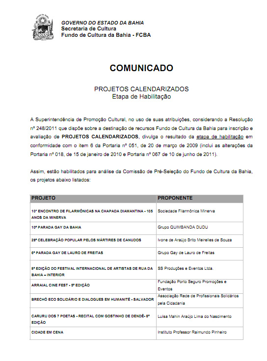 A Superintendência de Promoção Cultural, no uso de suas atribuições, considerando a Resolução nº 248/2011 que dispõe sobre a destinação de recursos Fundo de Cultura da Bahia para inscrição e avaliação de PROJETOS CALENDARIZADOS, divulga o resultado da etapa de habilitação.