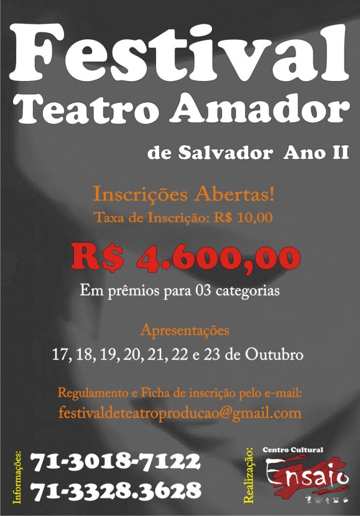As apresentações acontecerão entre 17 e 23 de Outubro quando os trabalhos serão avaliados por profissionais da área de teatro nomeados pela comissão organizadora do Festival de Teatro Amador de Salvador – Ano II. O Evento será realizado no Centro Cultural Ensaio e a seleção será efetuada através da análise do material enviado pelos grupos. As inscrições acontecem de Segunda a Sábado entre 08 e 27 de Agosto das 10h00min às 20h:00min no local. O responsável deverá comparecer ao local com 02 cópias do Regulamento e Ficha de inscrição (solicitados pelo e-mail: festivaldeteatroproducao@gmail.com); 01 cópia do Texto; Pagamento da taxa (R$ 10,00); Histórico do grupo; 02 fotos do espetáculo impressas e em cd.