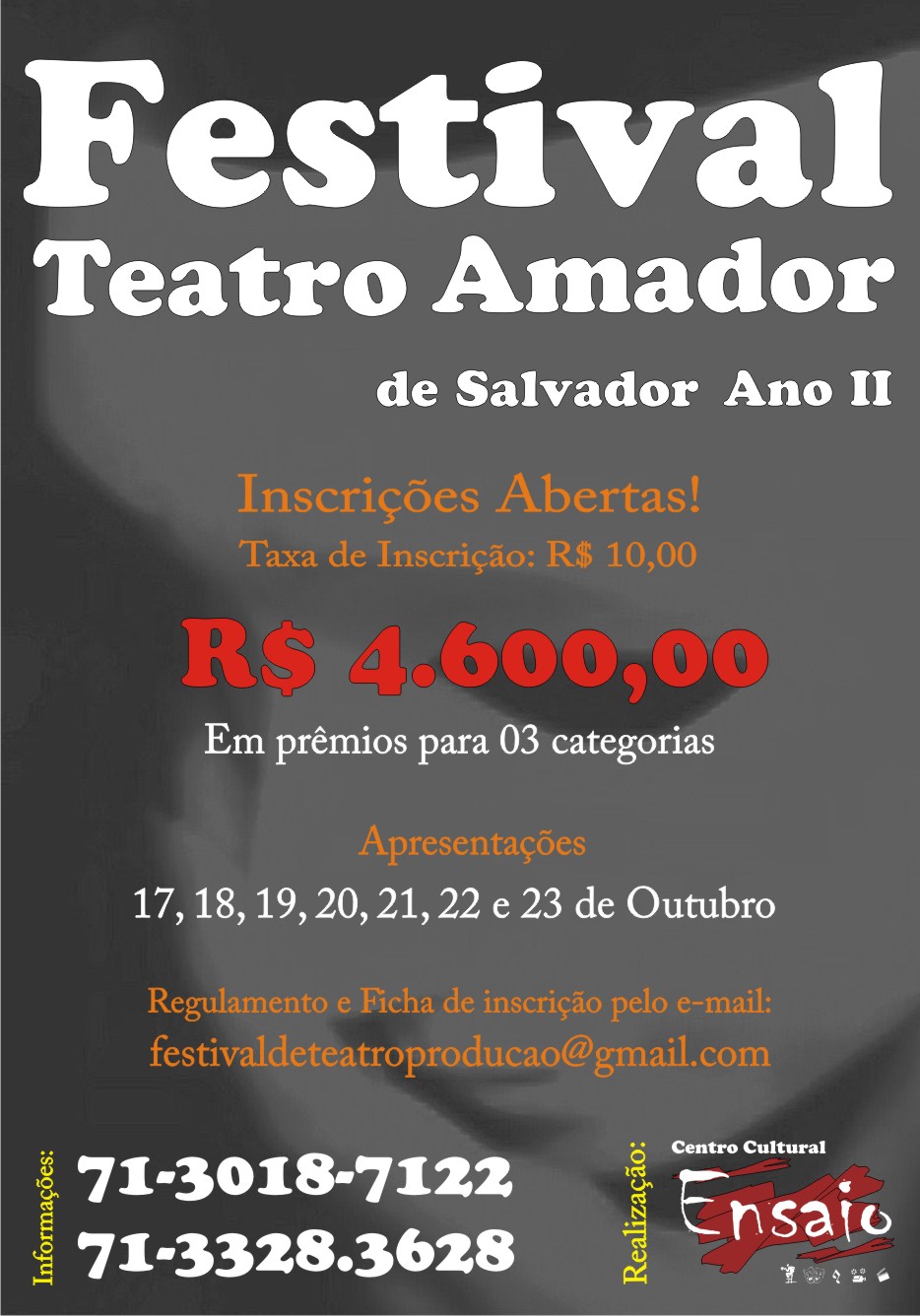 O Centro Cultural Ensaio prepara-se para a realização da segunda edição do Festival de Teatro Amador de Salvador. O Festival tem por objetivo cadastrar e divulgar Grupos de Teatro Amador que atuam na cidade do Salvador, inserindo esses Grupos dentro de um processo profissional e apresentando-os a um público formador de opinião, que passará a observar e valorizar o trabalho desses aspirantes a profissionais das artes cênicas.