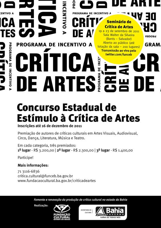 Com intenção de contribuir para o desenvolvimento das artes produzidas na Bahia e da percepção analítica dos cidadãos do estado, a Fundação Cultural do Estado da Bahia (FUNCEB), unidade da Secretaria de Cultura do Estado (SecultBA), lança o Programa de Incentivo à Crítica de Artes. A iniciativa, inserida na política de formação e qualificação de criadores, técnicos, produtores e pesquisadores da área, apresenta duas ações iniciais: o Concurso Estadual de Estímulo à Crítica de Artes e o I Seminário Baiano de Crítica de Artes. O Programa se justifica pela importância da crítica cultural para o fortalecimento da produção artística, o reconhecimento e a qualificação de profissionais da área e o progresso do posicionamento do público perante aquilo que as artes lhe proporcionam. Enquanto ferramenta que identifica os nexos entre a obra e as condições artísticas e sociais inerentes à mesma, a crítica e o seu autor têm papel reflexivo na intermediação entre a obra e aqueles que a apreciam. Assim, possibilitam um debate capaz de colaborar para a consolidação de um ambiente social propício ao acolhimento devido do setor da Cultura. Tendo como público-alvo jornalistas, escritores, blogueiros, pesquisadores e profissionais da cultura, o Programa de Incentivo à Crítica de Artes se empenha em gerar, no estado da Bahia, as condições adequadas à empregabilidade destas pessoas e à renovação da criticidade. Para tanto, investe na formação, produção, criação, circulação e difusão do exercício da análise crítica para as mais variadas expressões artísticas e culturais na Bahia. Concurso Estadual de Estímulo à Crítica de Artes – Com inscrições abertas de 22 de agosto a 16 de dezembro de 2011, o edital Concurso Estadual de Estímulo à Crítica de Artes vai premiar autores da Bahia de críticas culturais referentes a sete linguagens artísticas: Artes Visuais, Audiovisual, Circo, Dança, Literatura, Música e Teatro. Em cada uma destas categorias, haverá três premiados: 1º lugar (R$ 3,2 mil), 2º lugar (R$ 2,3 mil) e 3º lugar (R$ 1,4 mil), totalizando um investimento total em premiações de R$ 48,3 mil. Os proponentes devem apresentar duas críticas inéditas: uma sobre um produto cultural baiano e outra de livre escolha. Para participar, é preciso ser maior de idade, brasileiro nato ou naturalizado, domiciliado na Bahia, ou estrangeiro com situação de permanência legalizada e residência no estado. O texto de edital, bem como seus anexos e uma lista de obras, por linguagem, que pode ser usada como referência para a produção das críticas, está disponível no site da FUNCEB (www.funceb.ba.gov.br). I Seminário Baiano de Crítica de Artes – Para promover a formação na área, incentivar o posicionamento crítico de pensadores da cultura e estimular a participação da população no edital, o I Seminário Baiano de Crítica de Artes reúne profissionais de grande experiência na área de crítica cultural e crítica específica nas linguagens artísticas. O evento se realiza de 19 a 23 de setembro, na Sala Walter da Silveira (Barris), aberto ao público, com entrada franca (até lotação da sala, 200 lugares). A programação se inicia com a palestra “Perspectiva teórica e histórica da crítica cultural no Brasil”, ministrada por Antônio Marcos Pereira (19/9, segunda, 18h30 às 21h30). No dia seguinte (20/9, terça, 18h30 às 21h30), José Miguel Wisnik fala do “Panorama atual da crítica no Brasil e os seus desafios”. Na tarde de quarta-feira (21/9, 14h00 às 18h00), começam as falas específicas de linguagens: “A crítica teatral na Bahia”, com Gideon Rosa; “A crítica musical na Bahia”, com Chico Castro Jr; e “A crítica literária na Bahia”, com Milena Britto. Na quinta-feira (22/9, 18h30 às 21h30), o foco em linguagens continua com “A crítica cinematográfica na Bahia”, com Adalberto Meireles; “A crítica em artes visuais na Bahia”, com Alejandra Muñoz; e “A crítica em dança na Bahia”, com Eduardo A. Rosa Santana. Encerrando as atividades, na sexta-feira, 23/9, das 18h30 às 21h30, Ruy Gardnier conduz as “Oficinas práticas de crítica cultural”. SERVIÇO Concurso Estadual de Estímulo à Crítica de Artes Período de inscrições: 22 de agosto a 16 de dezembro de 2011 Inscrições presenciais: Na FUNCEB (Rua Gregório de Mattos, 29, Pelourinho, Salvador/BA) De segunda a sexta-feira, das 14 às 18 horas Inscrições via postal: Unicamente através do serviço Sedex com Aviso de Recebimento/AR, encaminhadas para: FUNDAÇÃO CULTURAL DO ESTADO DA BAHIA – CAIXA POSTAL 2485, CEP 40.020-970, Salvador – Bahia. Realização: FUNCEB/ SecultBA I Seminário Baiano de Crítica de Artes Quando: 19 a 23 de setembro de 2011 Onde: Sala Walter da Silveira (Barris – Salvador) Quanto: Entrada franca (até lotação da sala – 200 lugares) Programação: 19/9 (segunda) – 18h30 às 21h30 = Perspectiva teórica e histórica da crítica cultural no Brasil, com Antônio Marcos Pereira 20/9 (terça) – 18h30 às 21h30 = Panorama atual da crítica no Brasil e os seus desafios, com José Miguel Wisnik 21/9 (quarta) – 14h00 às 18h00 = A crítica teatral na Bahia, com Gideon Rosa = A crítica musical na Bahia, com Chico Castro Jr = A crítica literária na Bahia, com Milena Britto 22/9 (quinta) – 18h30 às 21h30 = A crítica cinematográfica na Bahia, com Adalberto Meireles = A crítica em artes visuais na Bahia, com Alejandra Muñoz = A crítica em dança na Bahia, com Eduardo A. Rosa Santana 23/9 (sexta) – 18h30 às 21h30 = Oficinas práticas de crítica cultural, com Ruy Gardnier Realização: FUNCEB/SecultBA Apoio: IRDEB/ Unijorge Site: www.fundacaocultural.ba.gov.br/criticadeartes E-mail: critica.cultural@funceb.ba.gov.br Telefone: 71 3116-6836