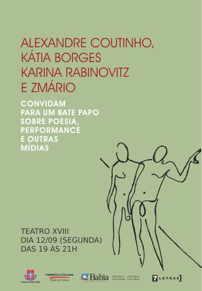 A poesia contemporânea produzida no Estado é tema de encontro entre escritores baianos, no próximo dia 12 de setembro (segunda-feira), às 19h, no Theatro XVIII. A mesa será mediada pelo escritor Alexandre Coutinho, que acaba de lançar o livro de poemas Estudos do Corpo (7Letras), contemplado por edital da Fundação Pedro Calmon/Secult. O evento visa aproximar o público leitor da produção literária baiana e contará com participações das poetas/jornalistas Kátia Borges e Karina Rabinovitz, além do performer Zmário. Na pauta, questões relativas a poesia moderna e às diversas linguagens poéticas relevantes enquanto suporte de ação e transformação sócio-cultural. A entrada é franca.