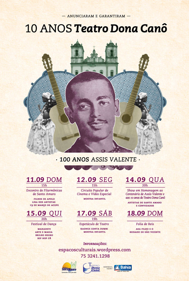 Neste mês de setembro o Teatro Dona Canô, um dos principais espaços culturais do Recôncavo, comemora 10 anos com uma programação diversificada e uma homenagem ao centenário de nascimento de um santamarense ilustre: Assis Valente. Nesta primeira década de funcionamento o teatro abrigou mais de 850 eventos e recebeu um público estimado em 250 mil espectadores. A noite do dia 14 de setembro – data de fundação do Teatro - será destinada a esta dupla comemoração: festejar o aniversário do Teatro Dona Canô e o talento do saudoso compositor.  A Secretaria de Cultura do Estado da Bahia, em parceria com a Secretaria Cultura de Santo Amaro, promoverá um show com releituras de composições de Assis Valente, com apresentações de artistas locais e convidados. Sob a direção artística de J. Veloso, o show contará com a presença de manifestações culturais e artistas santamarenses, tais como os músicos Ulisses Castro, Márcio Valverde, Lívia Millena, Eduardo Chaves e Marcel Fiúza, Stela Maris. Também está confirmada a presença de artistas nacionalmente reconhecidos como Margareth Menezes, Juliana Ribeiro e Roberto Mendes, além do próprio Jota Veloso e de Moreno Veloso. Além do show, os 10 anos do teatro contam com uma programação variada que se estende de 11 a 18 de setembro e inclui exibição de filmes infantis, apresentações de teatro, dança e música. A abertura e o encerramento das comemorações serão de forma tradicional, com apresentação que valorizam a cultura local.  No dia 11 de setembro, às 15h acontece será realizado um Encontro de Filarmônicas de Santo Amaro: Filhos de Apolo, Lira dos Artistas e 19 de Março de Acupe. Os festejos se encerram no dia 18, às 17h, com a apresentação da Folia de Reis dos grupos Asa Filho e o Reisado de São Vicente. Teatro Dona Canô O Teatro Dona cano abriu as portas no mês de aniversário de Claudionor Vianna Telles Velloso, conhecida nacionalmente como Dona Canô, a matriarca da família mais famosa de Santo Amaro da Purificação, os Veloso; berço dos cantores Caetano Veloso e Maria Bethânia, e da poetiza Mabel Veloso. Foi Dona Canô que, percebendo a carência de um meio cultural na cidade, buscou junto às autoridades políticas atender as reivindicações da população de Santo Amaro. Sendo assim, o teatro levou o seu nome como homenagem àquela que contribuiu para a cidade. O Teatro foi inaugurado em 14 de setembro de 2001 e tem capacidade para 274 pessoas.  Em uma década de funcionamento, já passaram por seu palco, artistas locais e nacionais, através de projetos como “Dona Canô Chamou”, primeiro projeto do espaço, “A Instituição vai ao Teatro, “A Associação vai ao Teatro” e “A Escola Vai ao Teatro”. Assis Valente José de Assis Valente nasceu em 19 de março de 1911, em Santo Amaro. Começou a compor sambas no início dos anos 30. A cantora Carmem Miranda foi a maior intérprete e divulgadora das canções de Assis Valente. Na voz da “Pequena Notável”, tornaram-se sucesso músicas como Camisa Listrada e Good Bye, Boy. Mas sua música mais famosa é Brasil Pandeiro, que foi primeiro gravada em 1940 pelo grupo Anjos do Inferno e estourou na década de 1970 na voz de Baby Consuelo e do grupo Os Novos Baianos. Mas apesar da carreira bem-sucedida como compositor cometeu suicídio em 1958, ingerindo guaraná com formicida. Muitos artistas regravaram a obra de Assis Valente, como Nara Leão, Chico Buarque e Adriana Calcanhoto. Na década de 90 o musical "O Samba Valente de Assis", sobre a trajetória do compositor, foi encenado no Rio de Janeiro.