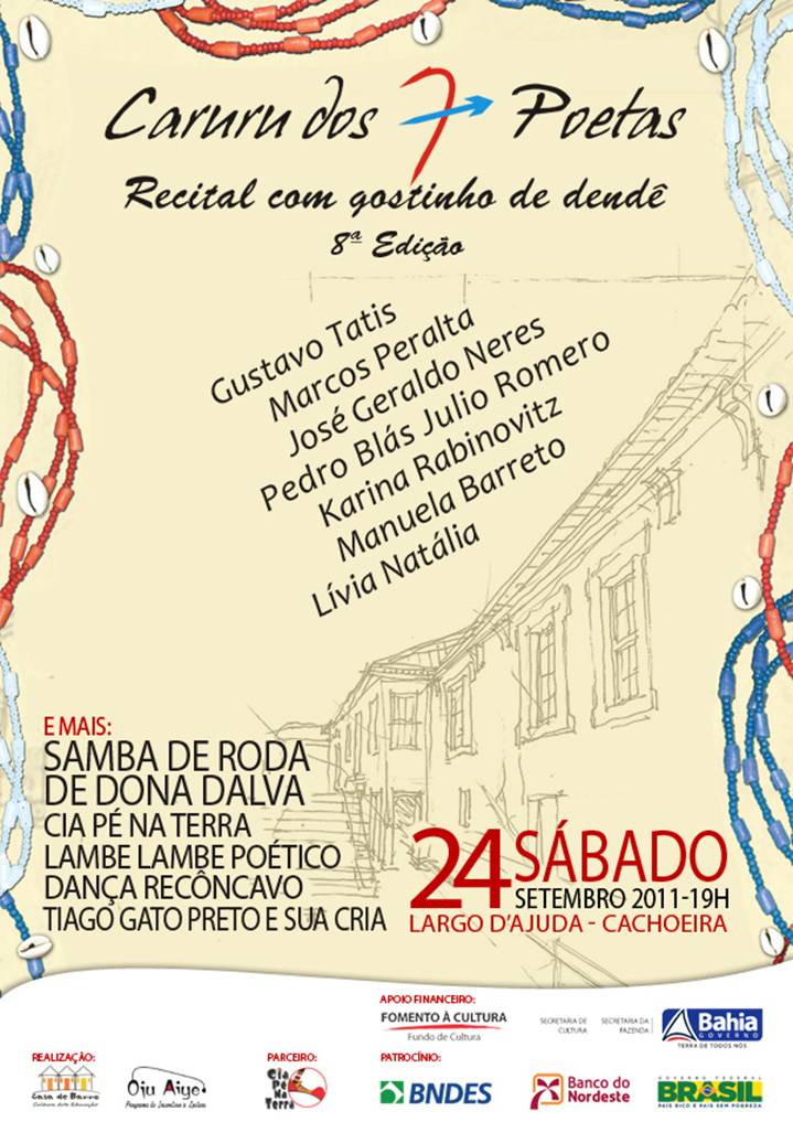 No dia 24 de setembro (2011) a partir das 19h acontecerá em Cachoeira no Largo d’Ajuda a 8ª edição do Caruru dos Sete Poetas –Recital com gostinho de dendê. Este é um evento que une à literatura um momento da tradição cultural e religiosa baiana, caruru dos sete meninos, de reverência aos Ibejis, da tradição afro-brasileira, e aos santos católicos São Cosme e Damião. Numa analogia aos sete meninos das manifestações religiosas, este projeto promove o encontro de sete poetas para recitar seus versos e celebrar a cultura e arte literária. É a miscelânea da poesia, comida baiana, lançamento de livros e performances artísticas com o propósito de integração e fruição de uma tradição cultural do Estado. Marcado pela diversidade de linguagens, tendências, correntes literárias e de público, o que se busca no processo de gestação do projeto é dar movimento e magia à literatura; agregar pessoas para ouvir poesia na voz do/a poeta; evidenciar a poesia do corpo e da dança, do teatro, do palhaço, da música; unir sete escritores, com alma de criança e poeta, para celebrar a literatura e as tradições culturais da Bahia. Dentre os sete poetas convidados: Marcos Peralta (Salvador – BA), Gustavo Tatis (Cartagena – Colômbia), José Geraldo Neres (SP), Karina Rabinovitz (Salvador – BA), Manuela Barreto (Salvador – BA), Lívea Natália (Salvador – BA) e Pedro Blás Julio Romero (Cartagena – Colômbia). Contaremos com a participação do Ponto de Cultura Expressão de Cidadania Quilombola do Centro de Educação e Cultura Vale do Iguape que apresentará a intervenção artística “Dança Recôncavo”, misto de toques e dança para os Ibejis sob influência da cultura e religiosidade do Recôncavo Baiano. Durante a atividade acontecerá ainstalação interativa “Lambe Lambe Poético” de Karina Rabinovitz e Silvana Rezende, onde pessoas entrarão no tradicional equipamento de lambe-lambe e vivenciarão situações poéticas. O evento será iniciado com uma programação infantil com a Cia Pé na Terra com a intervenção de 7 palhaços. Para encerrar a programação contaremos com a apresentação do Samba de Roda de Dona Dalva. Conta com o patrocínio do BNB/BNDES e apoio financeiro do Fundo de Cultura/Secretaria de Cultura e Secretaria da Fazenda da Bahia.