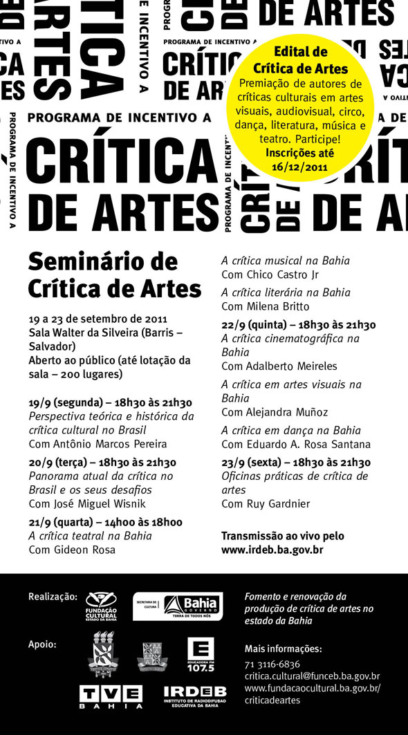Reunindo profissionais de grande experiência na área de crítica cultural e crítica específica nas linguagens artísticas, o evento se realiza na Sala Walter da Silveira (Barris), aberto ao público, com entrada franca, até lotação da sala (200 lugares). Para os interessados que não puderem se fazer presentes, o Seminário terá transmissão ao vivo pelo Portal do IRDEB (www.irdeb.ba.gov.br), permitindo também o acesso aos conteúdos por pessoas do interior do estado e de todo o país. A programação se inicia com a palestra “Perspectiva teórica e histórica da crítica de artes no Brasil”, ministrada por Antônio Marcos Pereira (19/9, segunda, 18h30 às 21h30). No dia seguinte (20/9, terça, 18h30 às 21h30), José Miguel Wisnik fala do “Panorama atual da crítica no Brasil e os seus desafios”. Na tarde de quarta-feira (21/9, 14h00 às 18h00), começam as falas específicas de linguagens: “A crítica teatral na Bahia”, com Gideon Rosa; “A crítica musical na Bahia”, com Chico Castro Jr; e “A crítica literária na Bahia”, com Milena Britto. Na quinta-feira (22/9, 18h30 às 21h30), o foco em linguagens continua com “A crítica cinematográfica na Bahia”, com Adalberto Meireles; “A crítica em artes visuais na Bahia”, com Alejandra Muñoz; e “A crítica em dança na Bahia”, com Duto Santana. Encerrando as atividades, na sexta-feira, 23/9, das 18h30 às 21h30, Ruy Gardnier conduz as “Oficinas práticas de crítica de artes”. O I Seminário Baiano de Crítica de Artes integra o Programa de Incentivo à Crítica de Artes (www.fundacaocultural.ba.gov.br/criticadeartes), da Fundação Cultural do Estado da Bahia (FUNCEB), unidade da Secretaria de Cultura do Estado (SecultBA), que, inserido na política de formação e qualificação de criadores, técnicos, produtores e pesquisadores, objetiva contribuir para o desenvolvimento das artes produzidas na Bahia e da percepção analítica dos cidadãos do estado. Além do Seminário, o Programa apresenta o Concurso Estadual de Estímulo à Crítica de Artes, que vai premiar autores da Bahia de críticas referentes a sete linguagens artísticas: Artes Visuais, Audiovisual, Circo, Dança, Literatura, Música e Teatro. Em cada uma destas categorias, haverá três premiados: 1º lugar (R$ 3,2 mil), 2º lugar (R$ 2,3 mil) e 3º lugar (R$ 1,4 mil), totalizando um investimento de R$ 48,3 mil em premiações. As inscrições ficam abertas até 16 de dezembro de 2011. O texto de edital, bem como seus anexos e uma lista de obras, por linguagem, que pode ser usada como referência para a produção das críticas, está disponível no site da FUNCEB (www.funceb.ba.gov.br). SERVIÇO I Seminário Baiano de Crítica de Artes Quando: 19 a 23 de setembro de 2011 Onde: Sala Walter da Silveira (Barris – Salvador) Quanto: Entrada franca (até lotação da sala – 200 lugares) Programação: 19/9 (segunda) – 18h30 às 21h30 = Perspectiva teórica e histórica da crítica de artes no Brasil, com Antônio Marcos Pereira 20/9 (terça) – 18h30 às 21h30 = Panorama atual da crítica no Brasil e os seus desafios, com José Miguel Wisnik 21/9 (quarta) – 14h00 às 18h00 = A crítica teatral na Bahia, com Gideon Rosa = A crítica musical na Bahia, com Chico Castro Jr = A crítica literária na Bahia, com Milena Britto 22/9 (quinta) – 18h30 às 21h30 = A crítica cinematográfica na Bahia, com Adalberto Meireles = A crítica em artes visuais na Bahia, com Alejandra Muñoz = A crítica em dança na Bahia, com Eduardo A. Rosa Santana 23/9 (sexta) – 18h30 às 21h30 = Oficinas práticas de crítica de artes, com Ruy Gardnier Realização: FUNCEB/SecultBA Apoio: IRDEB/ Faculdade de Letras da Universidade Federal da Bahia Concurso Estadual de Estímulo à Crítica de Artes Período de inscrições: 22 de agosto a 16 de dezembro de 2011 Inscrições presenciais: Na FUNCEB (Rua Gregório de Mattos, 29, Pelourinho, Salvador/BA) De segunda a sexta-feira, das 14 às 18 horas Inscrições via postal: Unicamente através do serviço Sedex com Aviso de Recebimento/AR, encaminhadas para: FUNDAÇÃO CULTURAL DO ESTADO DA BAHIA – CAIXA POSTAL 2485, CEP 40.020-970, Salvador – Bahia. Realização: FUNCEB/ SecultBA Site: www.fundacaocultural.ba.gov.br/criticadeartes E-mail: critica.cultural@funceb.ba.gov.br Telefone: 71 3116-6836