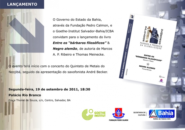 No dia 19 de setembro, o escritor baiano Marcos A. P. Ribeiro e o alemão Thomas Meinecke lançarão o livro Entre os “bárbaros filósofos” & Negro alemão. O evento será realizado às 18h30, no Palácio Rio Branco, Praça Municipal, ao som do Quinteto de Metais do Neojibá e apresentação do saxofonista André Becker. O livro é resultado de dois meses de experiências vividas pelos escritores em território estrangeiro. Essas vivências foram possíveis por meio do concurso Passado e Presente da Globalização: residências literárias nas cidades portuárias de Salvador e Hamburgo, realizado no final de 2009, pela Fundação Pedro Calmon/SecultBA, em parceria com o Goethe-Institut (Instituto Cultural Brasil-Alemanha - ICBA). O livro poderá ser adquirido no dia do lançamento pelo preço de capa de R$ 20 (vinte reais). Em edição bilíngüe (português e alemão), o livro traz na primeira parte o relato da experiência de Marcos Ribeiro, com o texto Entre os “bárbaros filósofos”. Ele relata sua visita à Alemanha, como se escrevesse num diário, contando suas vivências e suas impressões sobre as informações que os dois meses em Hamburgo proporcionam ao escritor baiano. No caso de Thomas Meinecke, suas reflexões e impressões sobre Salvador e o modo de vida do baiano são descritos numa espécie de ensaio cultural, uma crônica, onde o escritor também é personagem. Escrito na terceira pessoa, Negro alemão, também traz as observações de Thomas comparando-as com a cultura alemã e a cultura de outros lugares. Ao final tem-se a biografia de cada autor. “Esse mix de relatos e experiências vividas pelos autores numa harmônica sintonia entre duas culturas que há muito procura, não somente as intensas trocas comerciais ocorrida no tempo do Brasil império, nem somente a troca intelectual absorvida pela Bahia no pós-guerra”, relata o diretor-geral da Fundação Pedro Calmon, Ubiratan Castro de Araújo, no prefácio da obra. “Há de se intercambiar a cultura pela literatura, pensando no futuro”, ressalta o historiador. Encontro com o escritor - Sobre o livro Entre os “bárbaros filósofos” & Negro alemão, nos dias 16 e 22 deste mês, às 18h, os escritores Thomas Meinecke e Marcos Ribeiro, respectivamente, participam do projeto, na Biblioteca Pública do Estado.