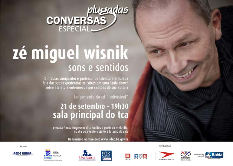 Em 21 de setembro (quarta-feira), às 19:30 horas, o professor, ensaísta, músico e compositor José Miguel Wisnik participa do projeto Conversas Plugadas Especial, na sala principal do Teatro Castro Alves. No bate-papo, Wisnik fala de literatura e entremeia a conversa com música, linguagens com as quais trabalha, apresentando esta transversalidade acompanhado de um piano. A entrada é franca e os ingressos são distribuídos a partir do meio-dia, no dia do evento. A palestra ainda será transmitida ao vivo pelo portal do IRDEB. Esta edição do Conversas Plugadas é uma realização do Teatro Castro Alves e da Fundação Cultural do Estado da Bahia (FUNCEB), unidade da Secretaria de Cultura do Estado (SecultBA), com apoio do Instituto de Radiodifusão Educativa da Bahia (IRDEB), Rede Bahia, Instituto de Letras da Universidade Federal da Bahia (UFBA) e Unijorge. CURRÍCULO – Nascido em São Vicente, São Paulo, em 1948, José Miguel Wisnik é Doutor em Teoria Literária, livre docente em Literatura Brasileira pela Universidade de São Paulo, ensaísta, compositor e músico. Como ensaísta, publicou O Coro dos Contrários – A Música em Torno da Semana de 22Música: O Nacional e o Popular na Cultura BrasileiraO Som e o SentidoSem Receita – Ensaios e CançõesJosé Miguel Wisnik – Livro de PartiturasVeneno Remédio – O Futebol e o Brasil; Machado Maxixe. Participou também dos livros coletivos Os Sentidos da Paixão; O Olhar; Ética; e Poetas que Pensaram o Mundo. Como compositor, lançou os CDs autorais José Miguel Wisnik (Camerati, 1993), São Paulo Rio (Maianga, 2000) e Pérolas aos Poucos(Maianga, 2003). Fez música para dança (Nazareth, do grupo Corpo, em 1993; Parabelo, em parceria com Tom Zé, para o mesmo grupo Corpo, em 1997; e Onqotô, em parceria com Caetano Veloso, em 2005), cinema (Terra Estrangeira, de Walter Salles Jr. e Daniela Thomas, em 1995; Janela da Alma, de João Jardim e Walter Carvalho, 2001) e teatro (As BoasHamlet; e Mistérios Gozozos, para o Teatro Oficina; além de Pentesiléias, de Daniela Thomas, dirigida por Bete Coelho). Dirigiu o CD Do Cóccix até o Pescoço, de Elza Soares (2002). Além da própria Elza Soares, tem músicas interpretadas por Ná Ozzetti, Jussara Silveira, Monica Salmaso, Maria Bethania, Zizi Possi, Zélia Duncan, Djavan e Caetano Veloso. Gal Costa gravou Embebedado, uma parceria de José Miguel Wisnik com Chico Buarque, no seu CD Hoje (2005). Recebeu o Prêmio Jabuti da Câmara Brasileira do Livro em 1978 (como Revelação de Autor), foi indicado na categoria Ensaio em 1989 e novamente premiado em 2009 (segundo lugar, na categoria Ciências Humanas). Recebeu a bolsa da John Simon Guggenheim Foundation (1983-84), o prêmio Noel Rosa como compositor revelação em 1989, o prêmio do Festival de Gramado na categoria música original para curta-metragem (1989), o prêmio da Associação Paulista de Críticos de Arte por suas produções para teatro e dança em 1991, 1993 e 1995, e o prêmio de melhor música do Festival de Cinema do Ceará, pelo documentário longa-metragemJanela da Alma, em 2001. Foi indicado para o Prêmio Multicultural Estadão (1998), para o Prêmio Rival da Música Popular Brasileira (2004) nas categorias melhor CD e melhor compositor, e para o Grammy Latino na categoria “Melhor canção brasileira”, com Ponte Aérea, gravada por Eveline Hecker no CD do mesmo nome. Em 2009, recebeu a Ordem do Mérito Cultural. Em janeiro-maio de 2006, também deu aulas como Professor visitante na Universidade da Califórnia, em Berkeley.
