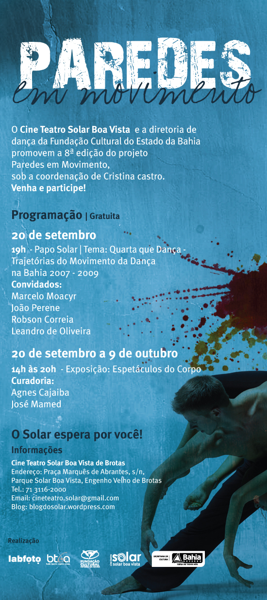 Projeto promove bate-papo sobre Dança e Intervenção Visual no Cine Teatro Solar Boa Vista Na próxima Terça-feira, dia 20/09, o Cine Teatro Solar Boa Vista (Engenho Velho de Brotas) realiza  a 8ª edição do projeto Paredes em Movimento, que mescla Dança e Artes Visuais. A cada edição, o acontece um bate-papo sobre temas relacionados à dança e uma intervenção visual nas paredes do SOLAR. Desta vez, o Papo SOLAR aborda o tema "Quarta que Dança - Trajetória do Movimento da Dança na Bahia 2007-2009" e conta com a participação de Marcelo Moacir, João Perene, Robson Correia e Leandro de Oliveira. Os artistas além de contar suas experiências com o Quarta que Dança, projeto realizado pela Diretoria de Dança da FUNCEB e que em 2011 será realizado também no SOLAR, e ainda irão apresentar suas percepções sobre os rumos da Dança na Bahia, entre 2007 e 2009. A intervenção visual fica por conta da Labfoto que apresentará a exposição Espetáculos do Corpo, que tem a curadoria assinada por Agnes Cajaíba e José Mamed.