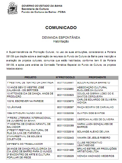 A Superintendência de Promoção Cultural, no uso de suas atribuições, considerando a Portaria 051/09 que dispõe sobre a destinação de recursos do Fundo de Cultura da Bahia para inscrição e avaliação de projetos culturais, comunica que estão habilitados, conforme item 6 da Portaria 051/09, e aptos para análise da Comissão Temática Especial do Fundo de Cultura, os projetos listados no documento que pode ser acessado através do link.